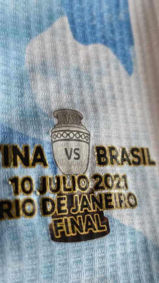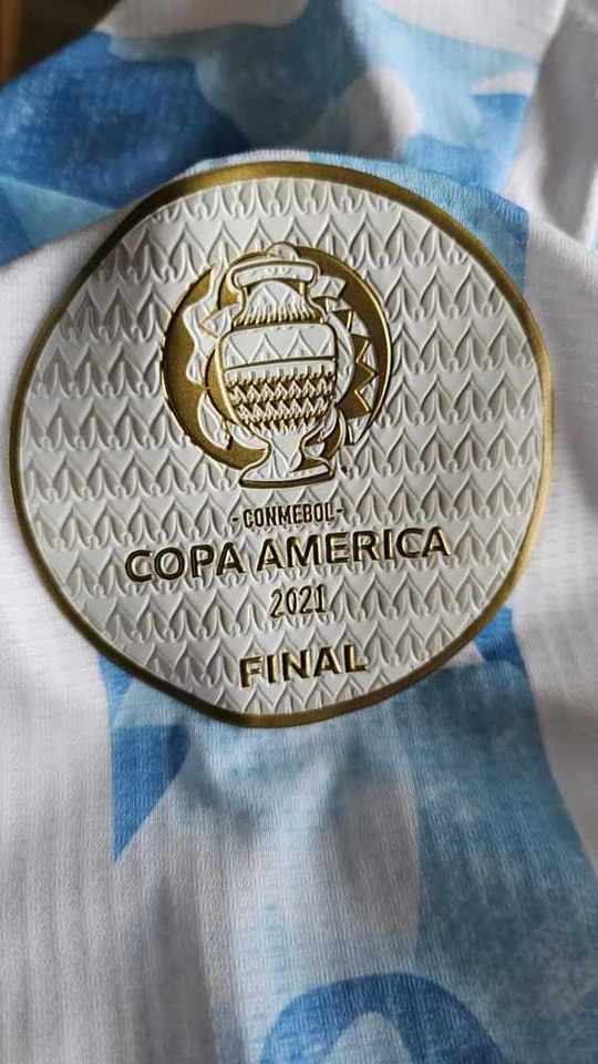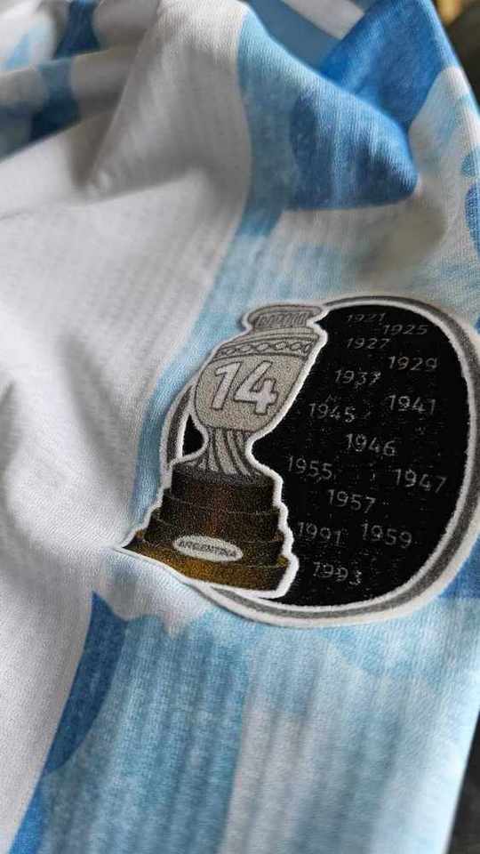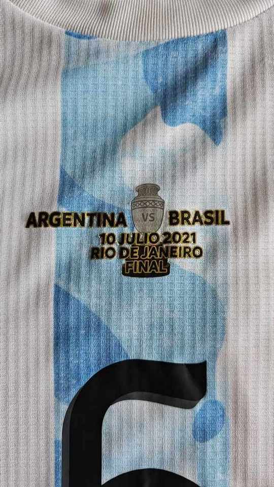 Patches: Final Copa América 2021 en manga derecha & Argentina #14 copas en manga izquierda. Matchday con marca del fabricante Kit Club