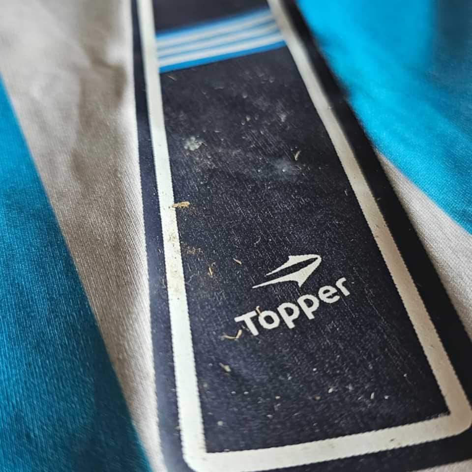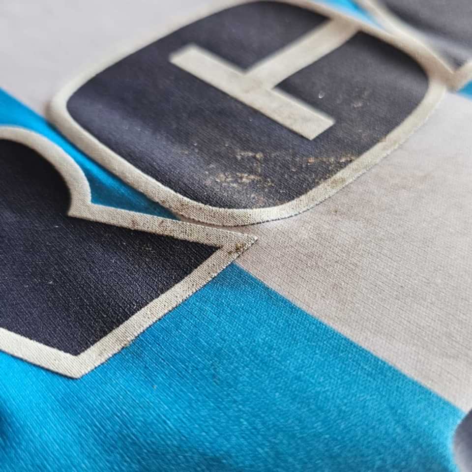 La camiseta se encuentra sucia y con manchas de pasto y barro tal cual fue entregada al finalizar el partido.