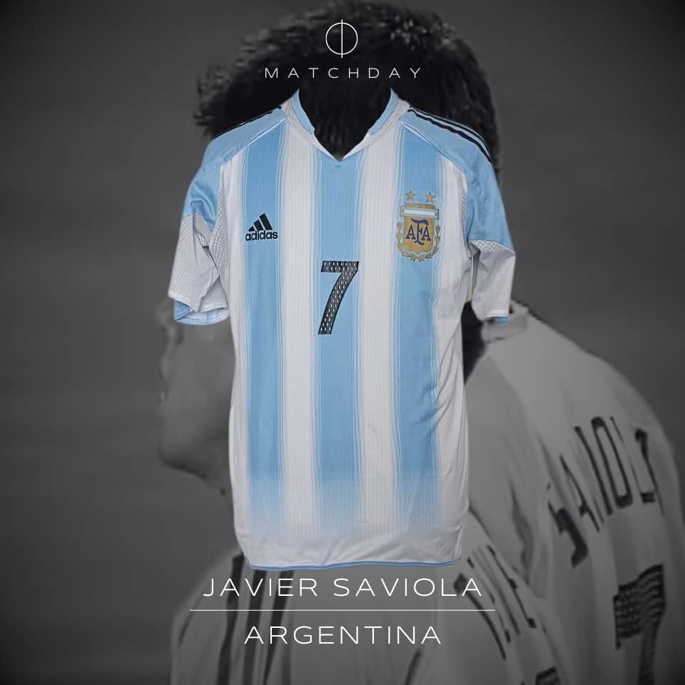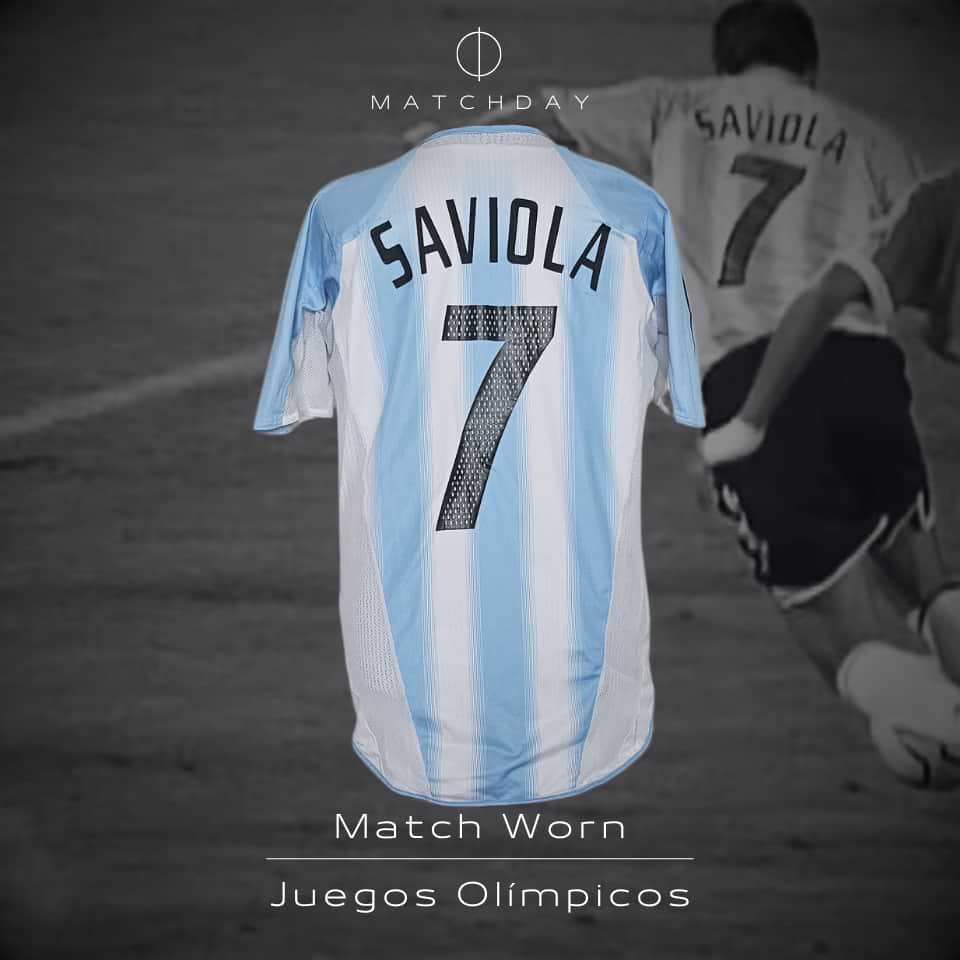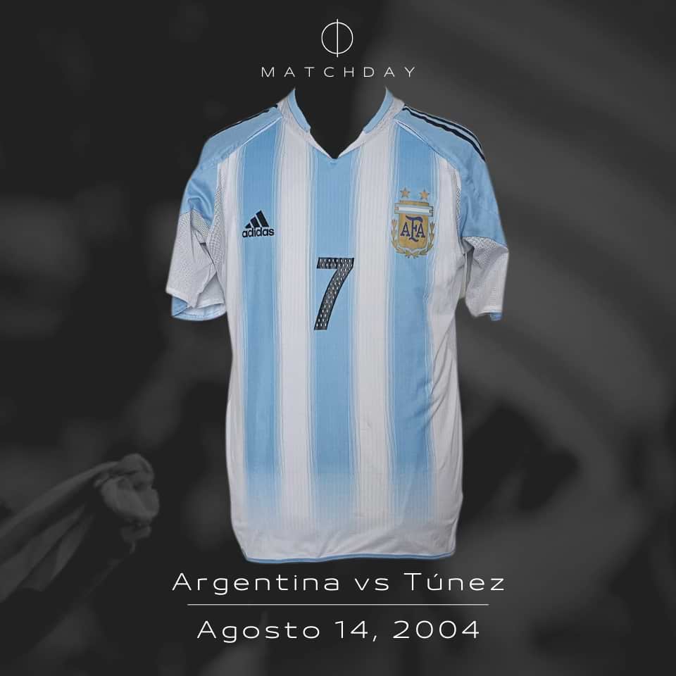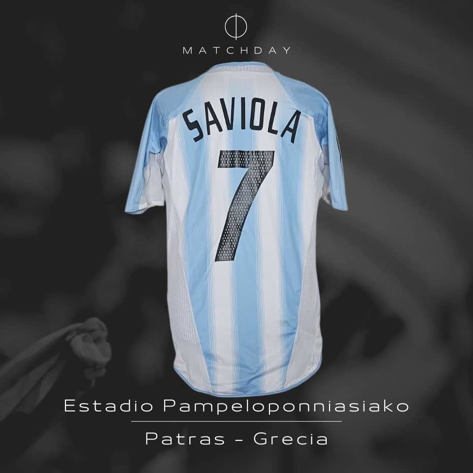 Camiseta usada por Javier “Conejito” Saviola en el partido disputado versus Túnez jugado el 14 de agosto de 2004 en Grecia, en los Juegos Olímpicos de Atenas 2004. El “Conejito” ingresó a los 56 minutos del segundo tiempo y convirtió el 2 a 0.