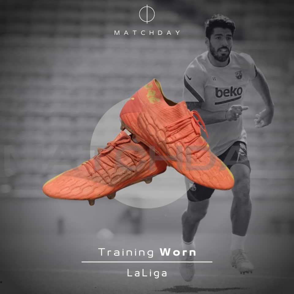 Match worn training boots by Luis Suarez in Barcelona during 2018. They were delivered by a Barcelona employee.