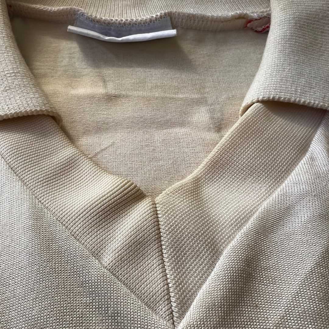 Modelo de camiseta con cuello en V, con solapa blanca con una linea roja, y escudo bordado cuya franja roja no atraviesa la palabra CARP.