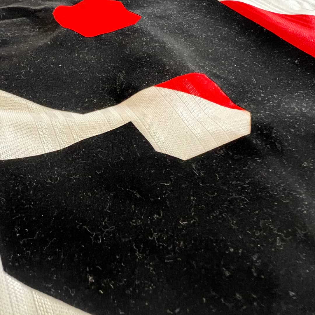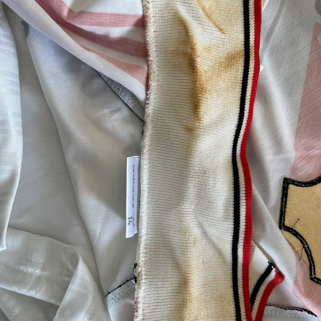 La camiseta conserva rastros de haber sido utilizada en juego, y posee las axilas con signos de transpiración.
