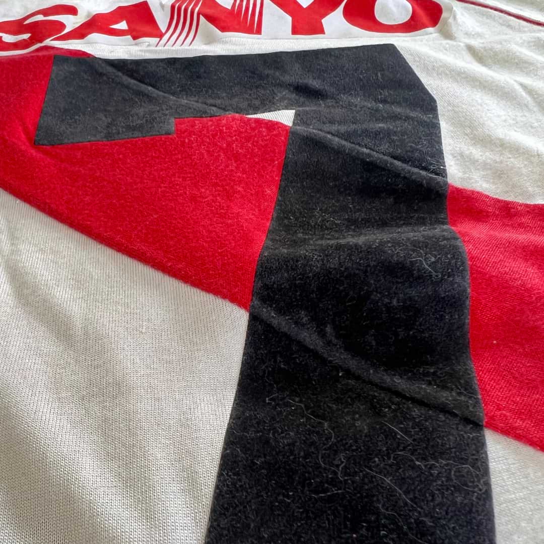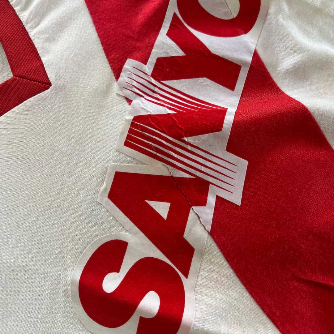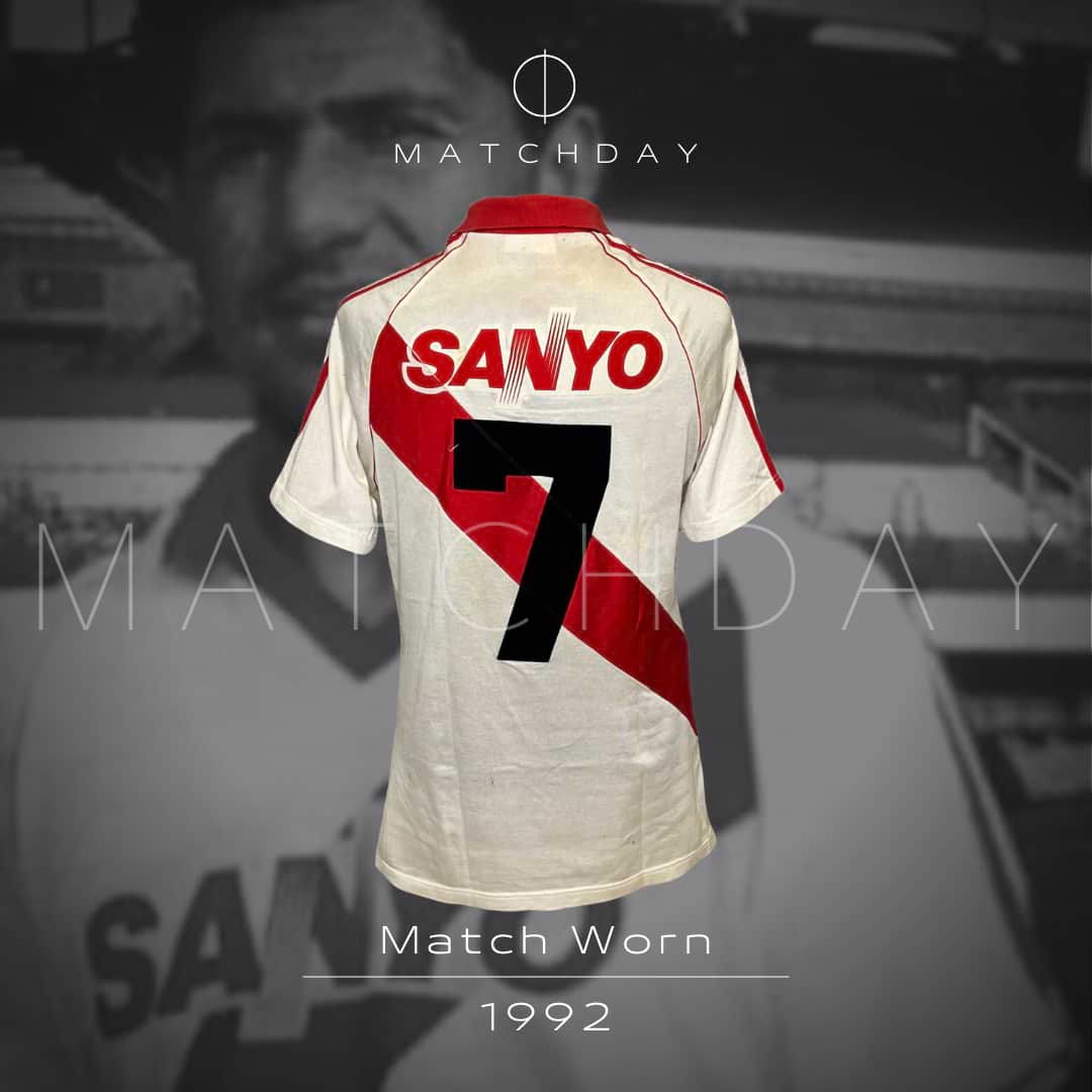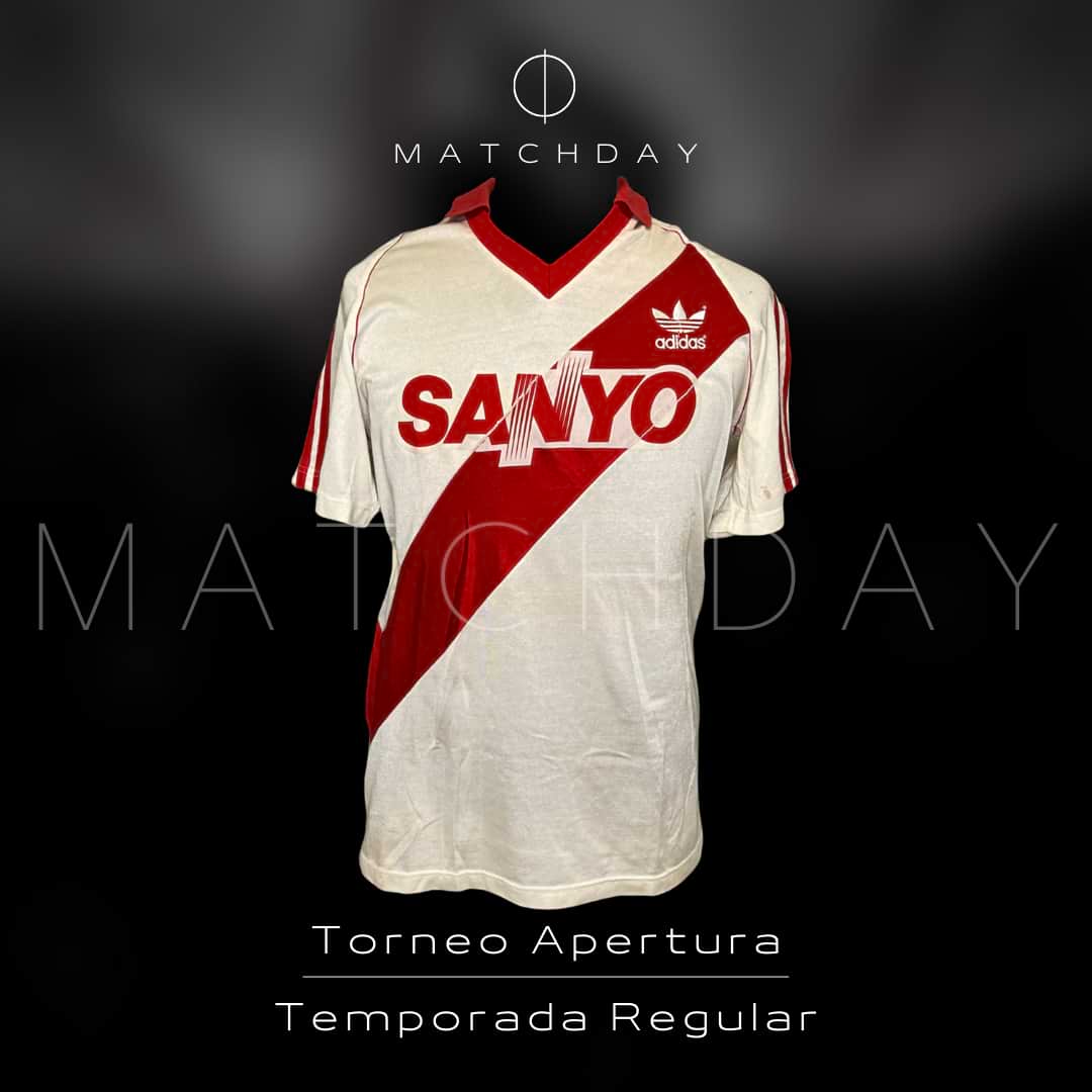 Primer modelo de camiseta en la historia de River Plate con publicidad Sanyo, utilizada durante algunos encuentros del Torneo Apertura 1992.
