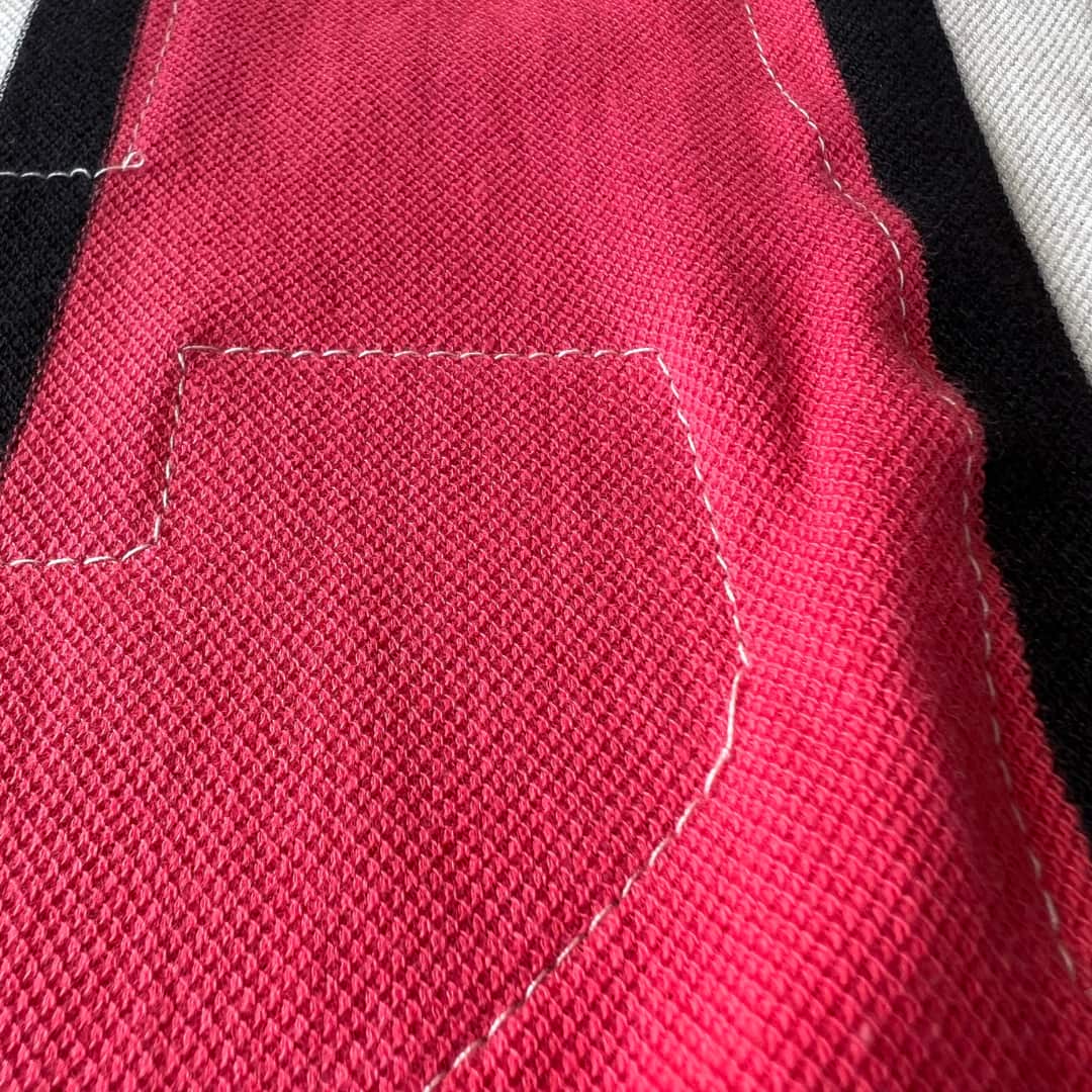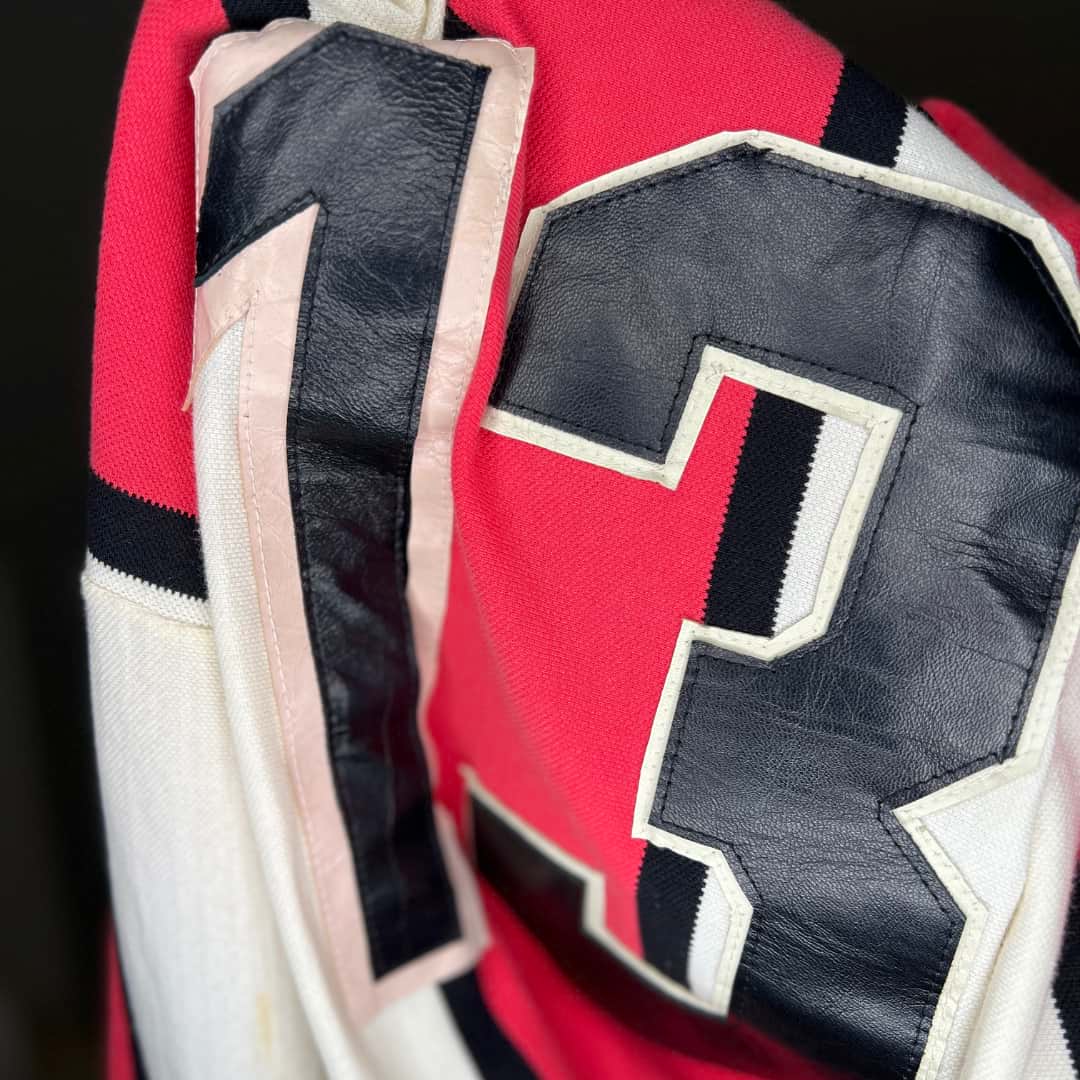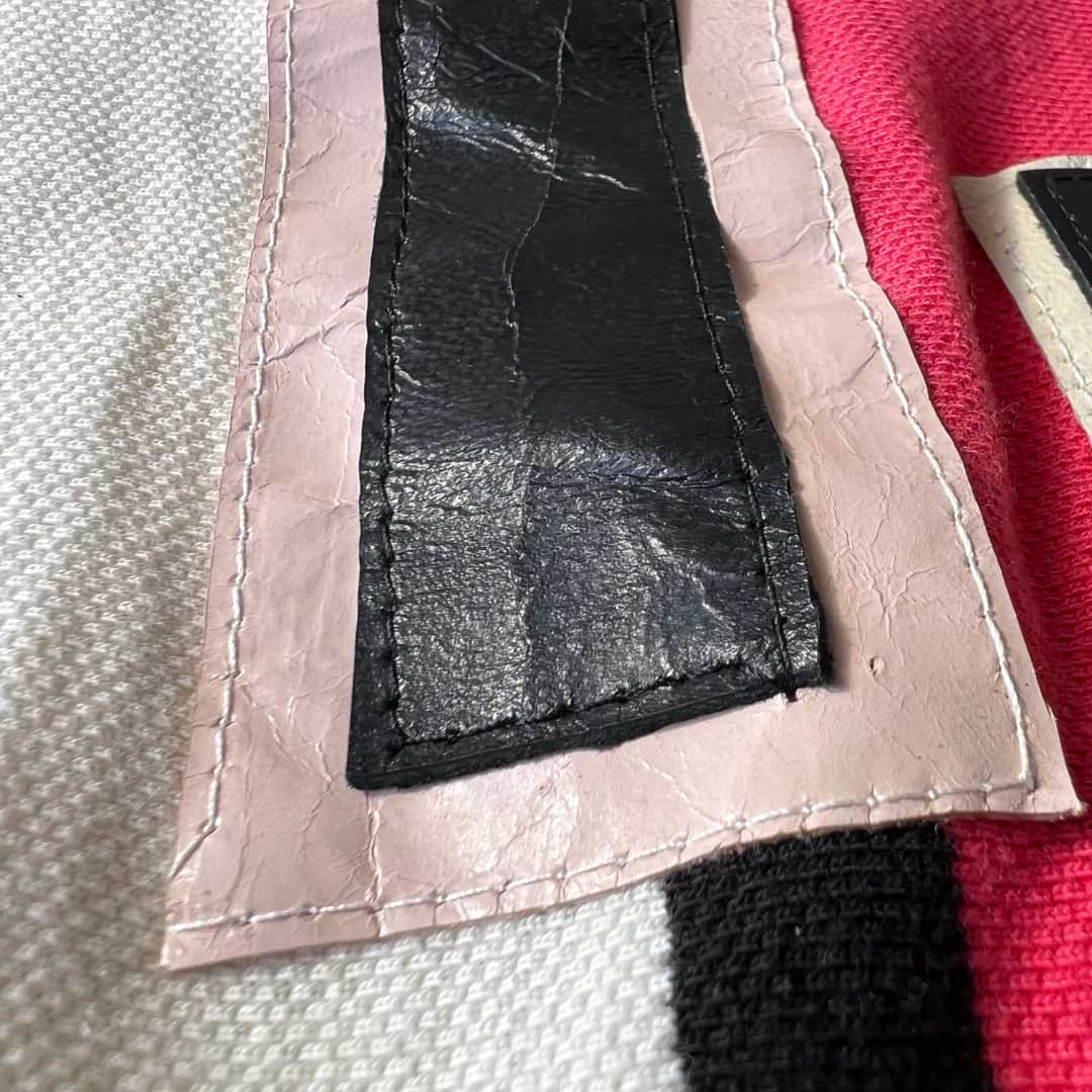Números de cuero negro cosidos sobre números de cuero blanco.