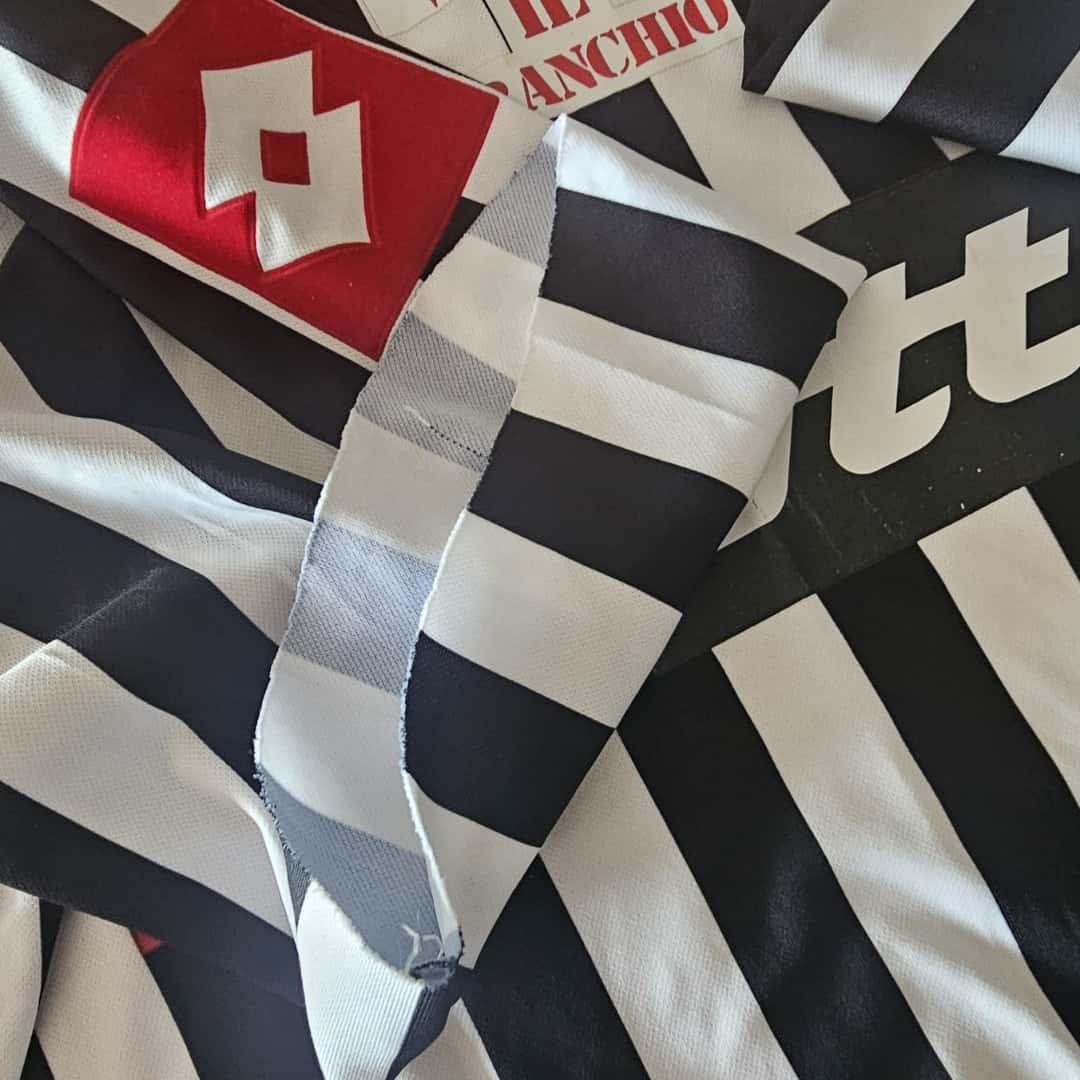 The shirt has its sleeves cut off with scissors, just like he wore it in the match.