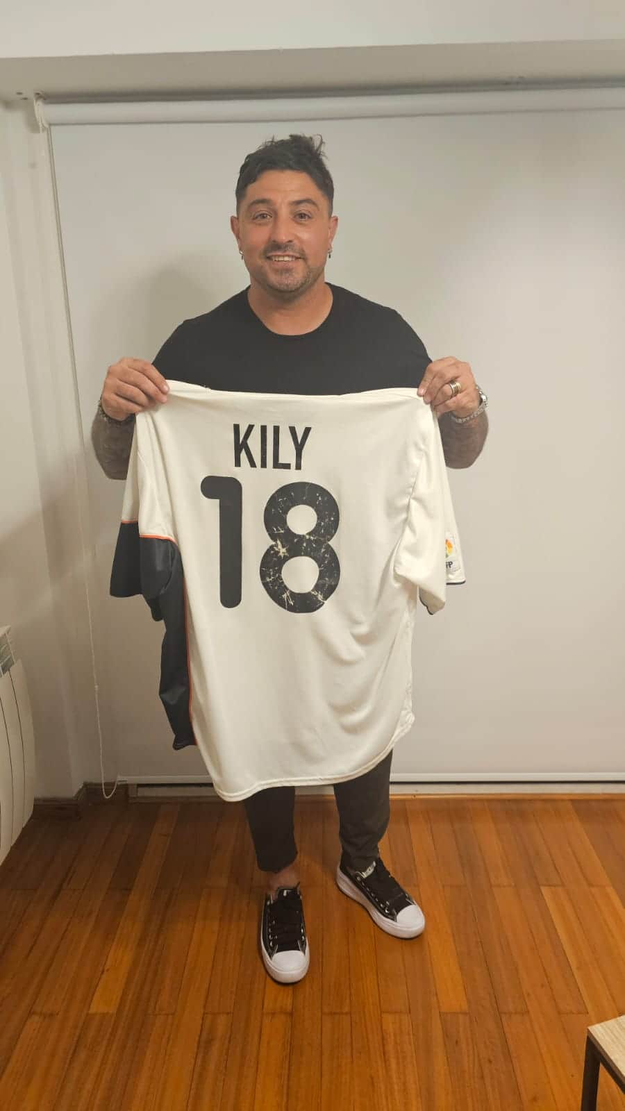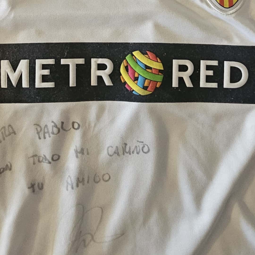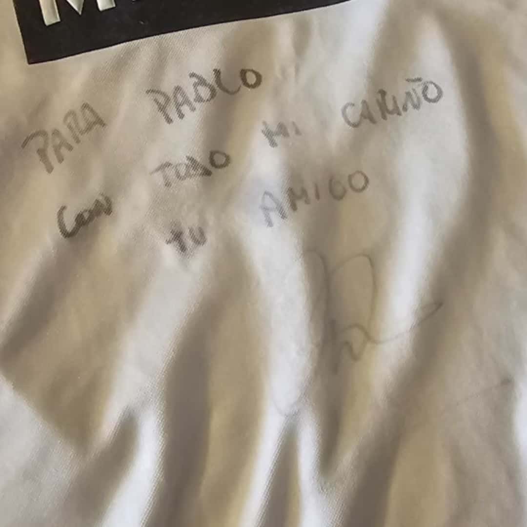 A jersey given by Kily González to Pablo Álvarez. It is autographed with the phrase “PARA PABLO CON TODO MI CARIÑO. TU AMIGO”.