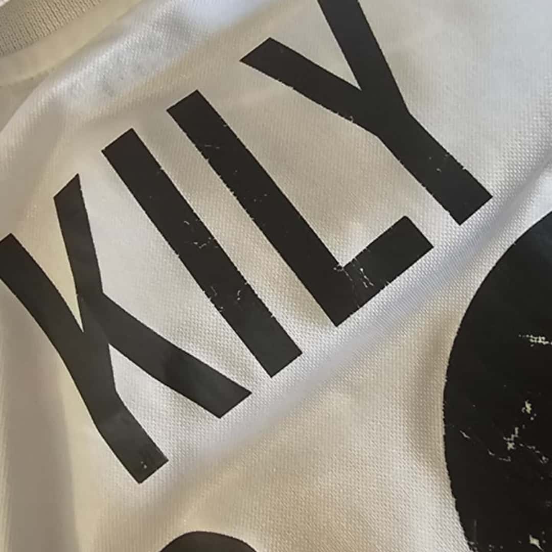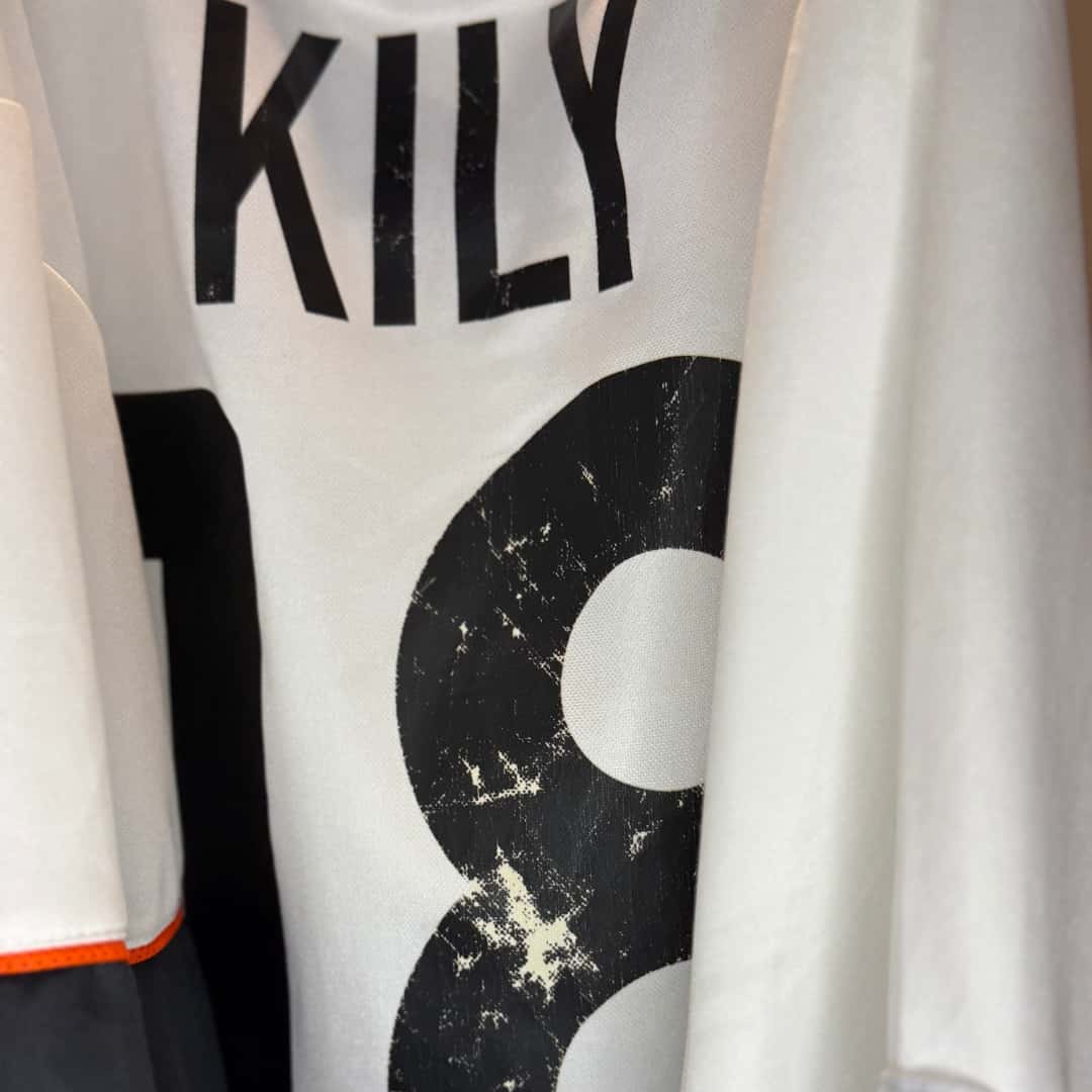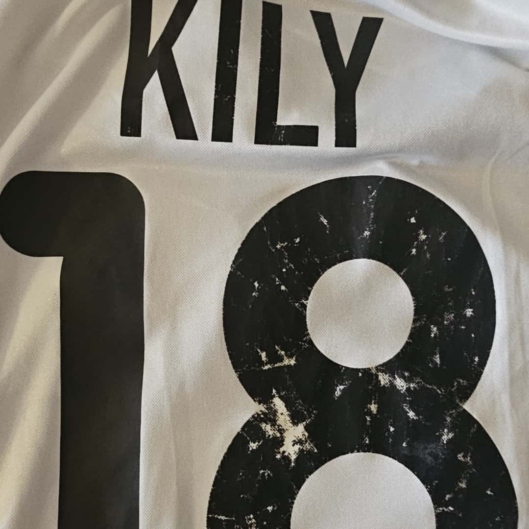 A jersey given by Kily González to Pablo Álvarez. It is autographed with the phrase “PARA PABLO CON TODO MI CARIÑO. TU AMIGO”.