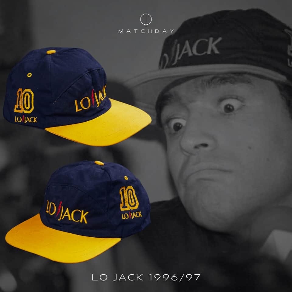 A completely custom-made cap for Diego Armando Maradona by the company Lo/jack. Diego wore them during training sessions, before and after matches with Boca Juniors in 1996, as part of an advertising contract.