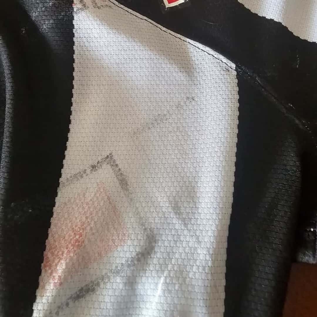 The shirt shows visible staining from being stored folded, and the printed materials are delicate.