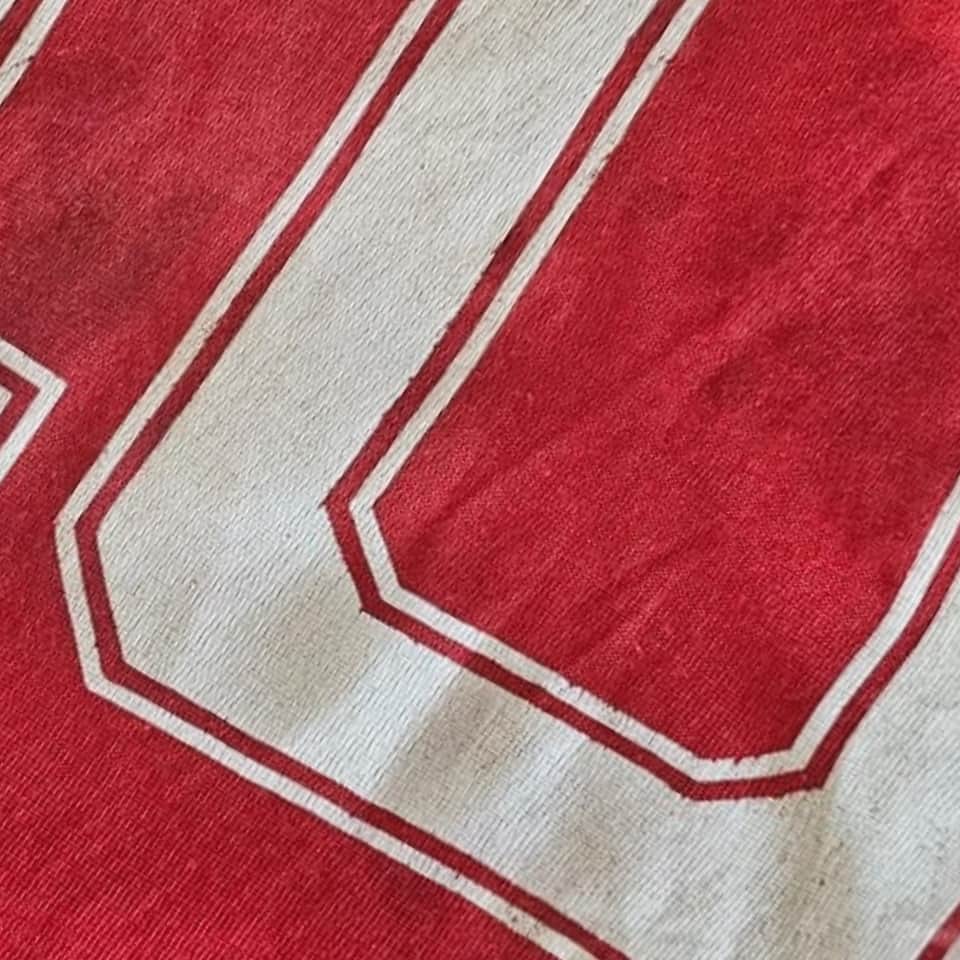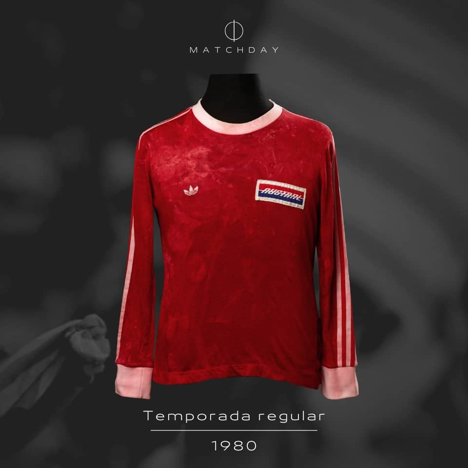 Camiseta titular de Argentinos Juniors color rojo, marca Adidas, cuello redondo blanco, mangas largas con puños blancos con las tres tiras representativas de la marca color blanco que se extienden desde el cuello hasta los puños, dorsal 10 pintado color blanco cuya tipografía presenta un fileteo borde blanco, logo adidas bordado en el lado derecho del pecho y la etiqueta bordada del sponsor austral cosida del lado izquierdo, usada por Diego Maradona en el campeonato nacional 1980. La camiseta presenta trazos decolorados en la tela ya que fue guardada al finalizar el partido con la humedad de la transpiración.