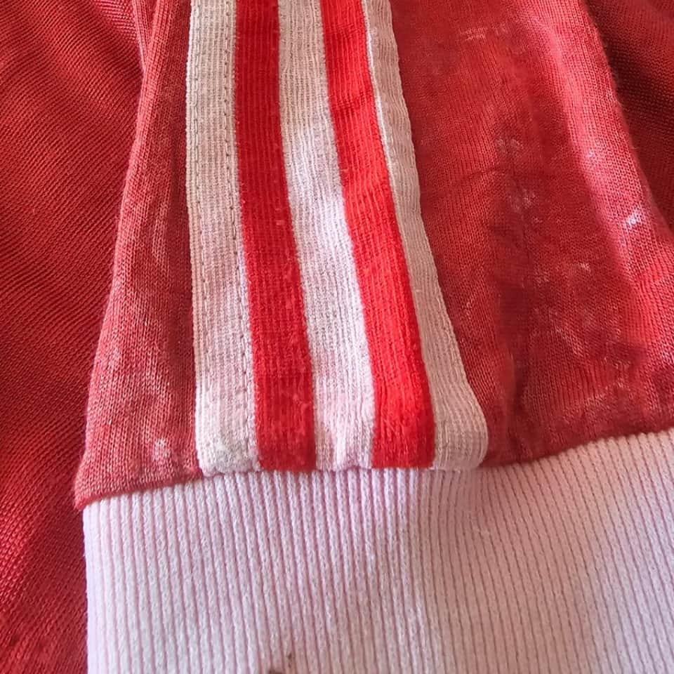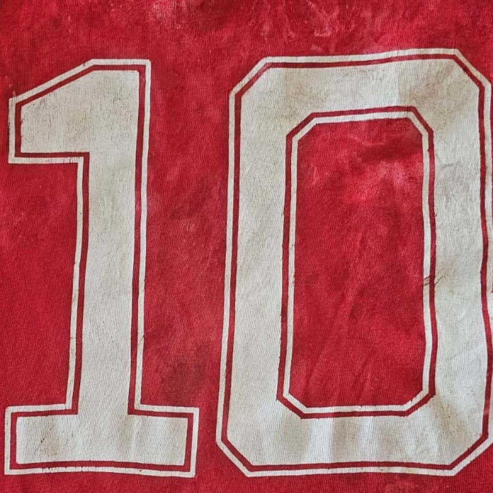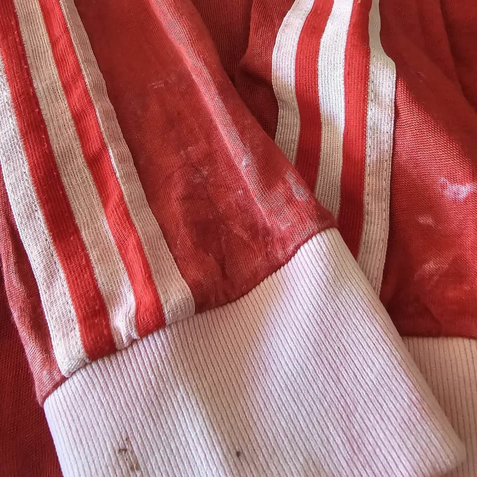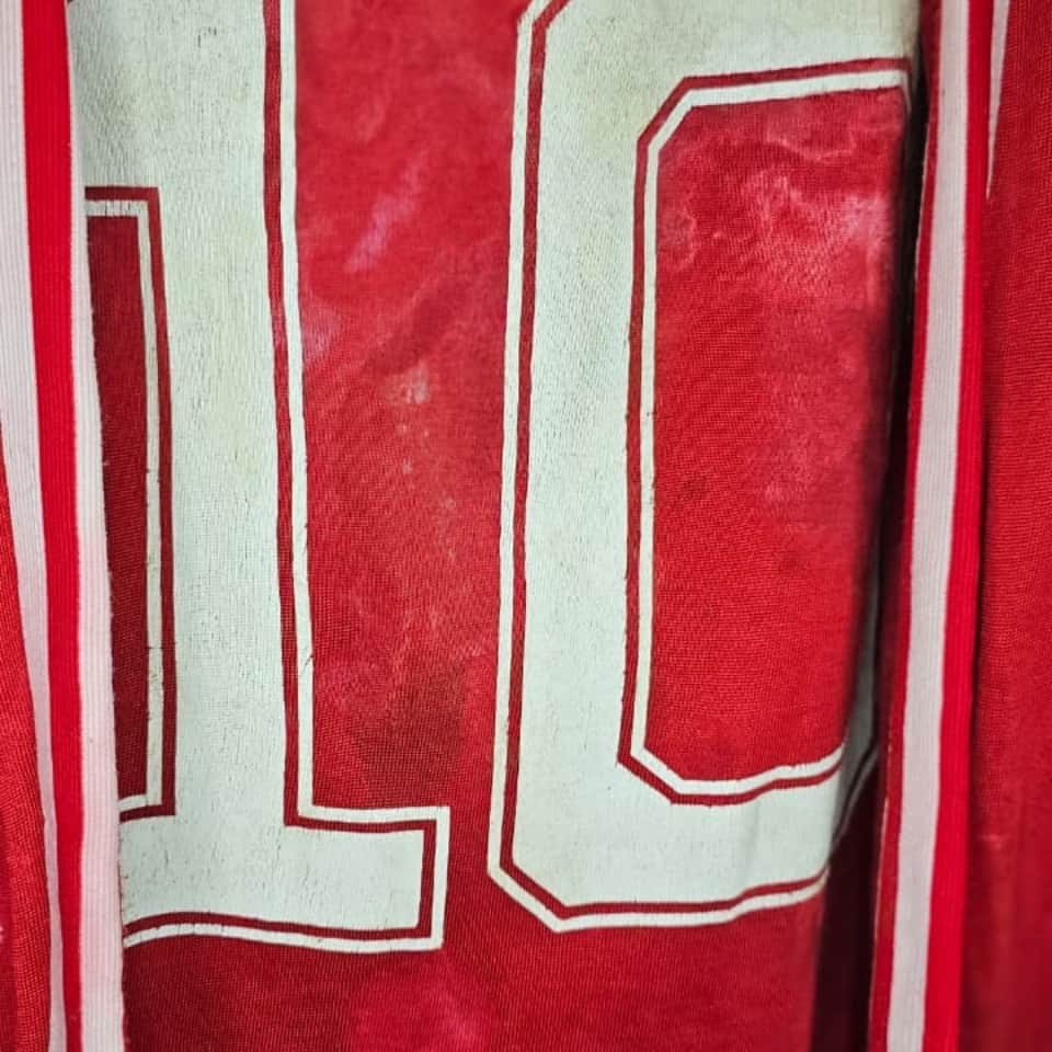 Argentinos Juniors red home jersey, Adidas brand, white round neck, long sleeves with white cuffs featuring the brand’s three white stripes extending from the neck to the cuffs, white number 10 with white border, Adidas logo embroidered on the right side of the chest and the Austral sponsor’s embroidered label sewn on the left side, worn by Diego Maradona in the 1980 national championship. The jersey has discolored marks on the fabric as it was stored at the end of the match with perspiration moisture.