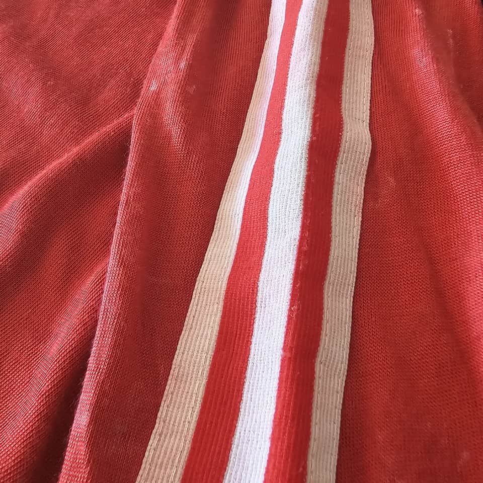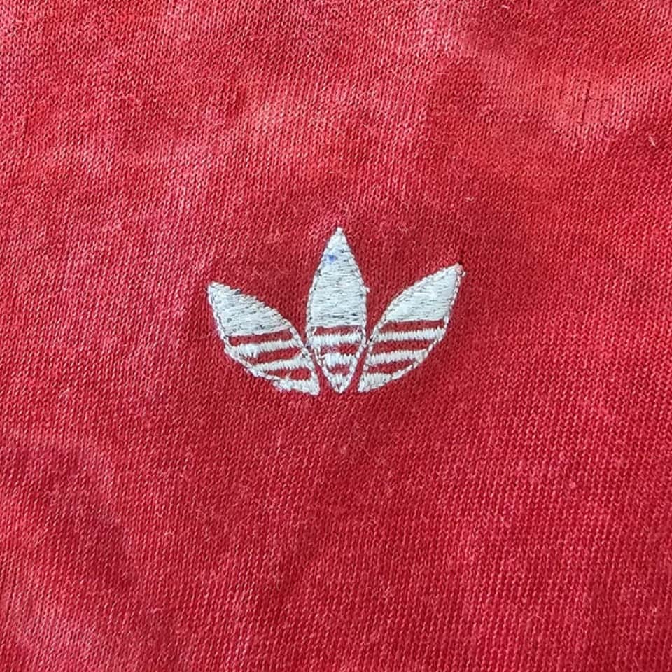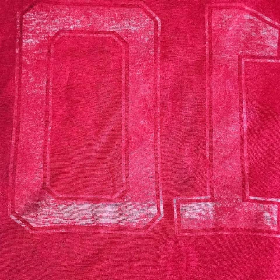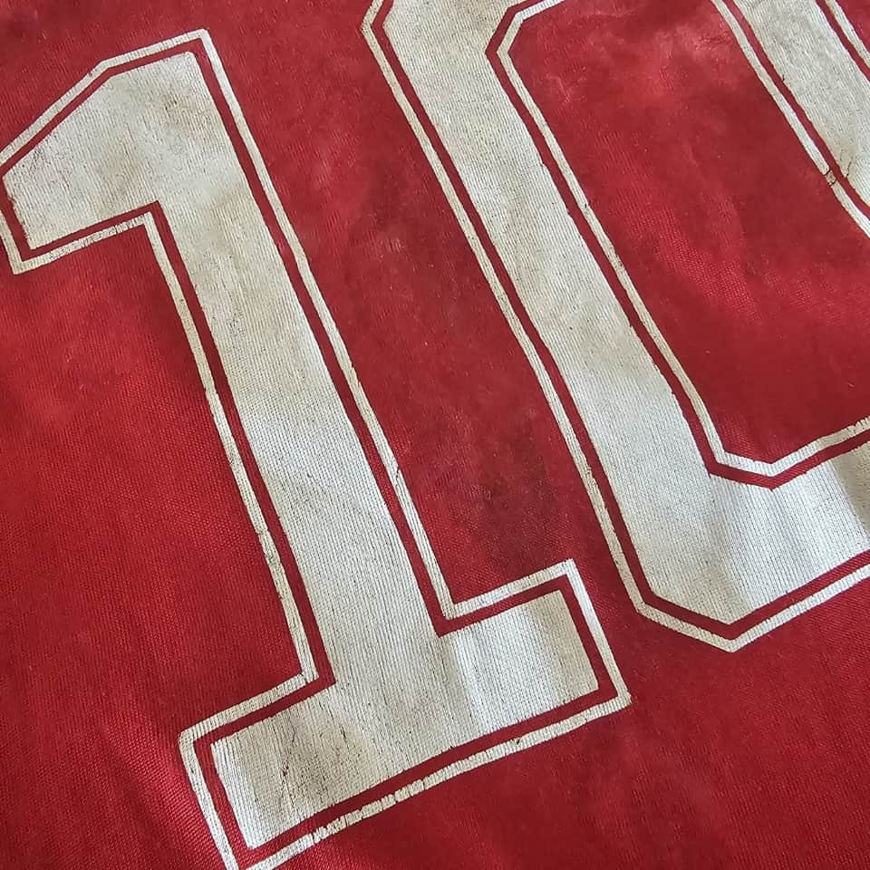 Argentinos Juniors red home jersey, Adidas brand, white round neck, long sleeves with white cuffs featuring the brand’s three white stripes extending from the neck to the cuffs, white number 10 with white border, Adidas logo embroidered on the right side of the chest and the Austral sponsor’s embroidered label sewn on the left side, worn by Diego Maradona in the 1980 national championship. The jersey has discolored marks on the fabric as it was stored at the end of the match with perspiration moisture.