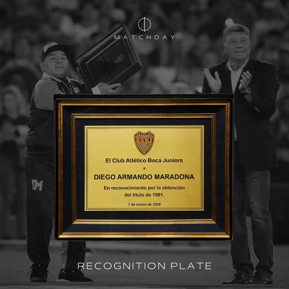 Recognition plate presented to Diego Maradona by the Boca Juniors management during the match against Gimnasia y Esgrima La Plata on March 7, 2020, at La Bombonera. The award honors Maradona for his historic title with Boca in 1981, the only official championship he won with the club.