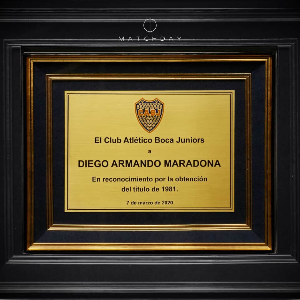 Placa entregada a Diego Maradona por la dirigencia de Boca Juniors durante el partido ante Gimnasia y Esgrima La Plata el 7 de marzo de 2020 en la Bombonera. El reconocimiento homenajea a Maradona por su histórico título con Boca en 1981, único campeonato oficial que conquistó con el club.