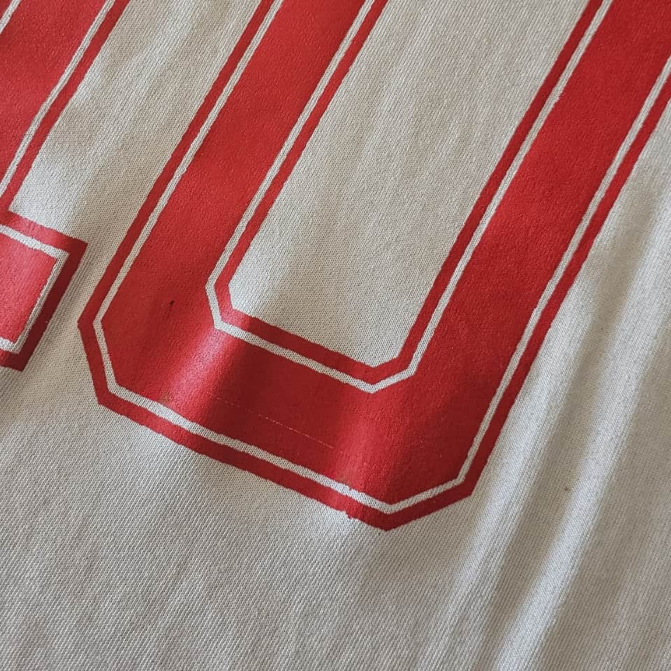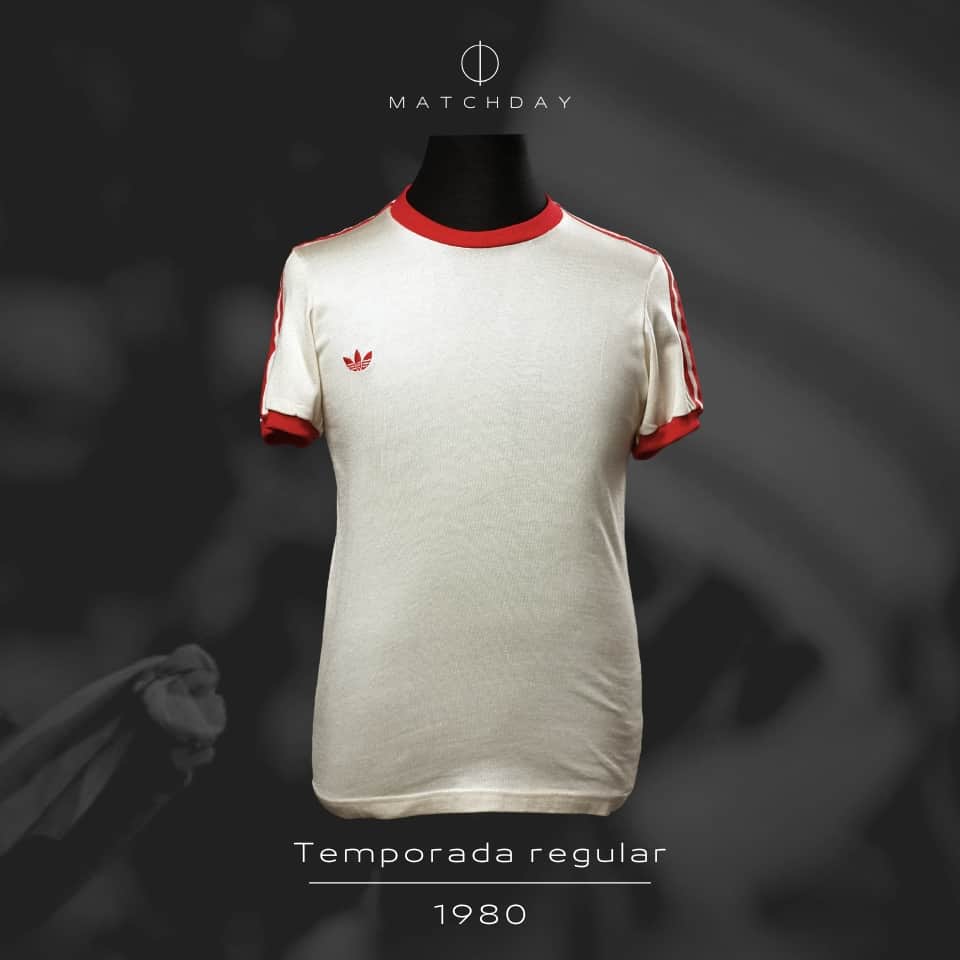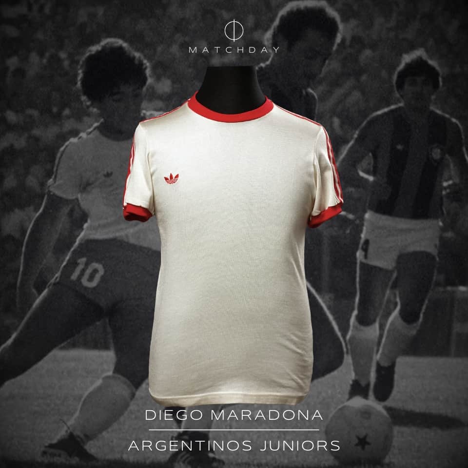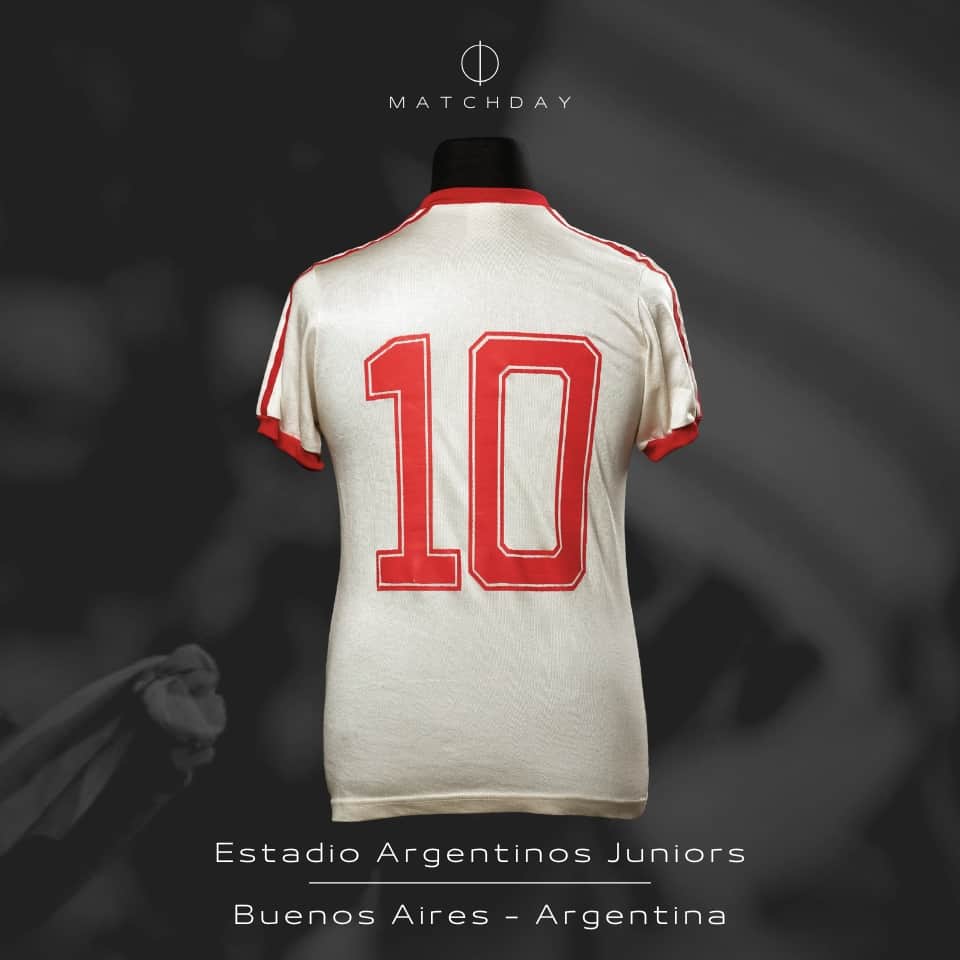 Camiseta suplente de Argentinos Juniors color blanca, marca adidas, cuello redondo con borde en color rojo, mangas cortas con puños en color rojo con las tres tiras representativas de la marca color rojo que se extienden desde el borde del cuello hasta los puños, dorsal 10 pintado color rojo cuya tipografía presenta un fileteo borde rojo, logo adidas bordado en el lado derecho del pecho, usada por Diego Maradona en el Campeonato Nacional 1980. Entre 1976 y 1981, Diego Maradona jugó 166 partidos y marcó 116 goles con Argentinos Juniors, siendo el máximo goleador del fútbol argentino en cinco torneos consecutivos —entre 1978 y 1980—, un récord que nadie ha igualado. Debutó en Primera con solo 15 años y se convirtió rápidamente en la gran figura del fútbol nacional antes de su paso a Boca Juniors.