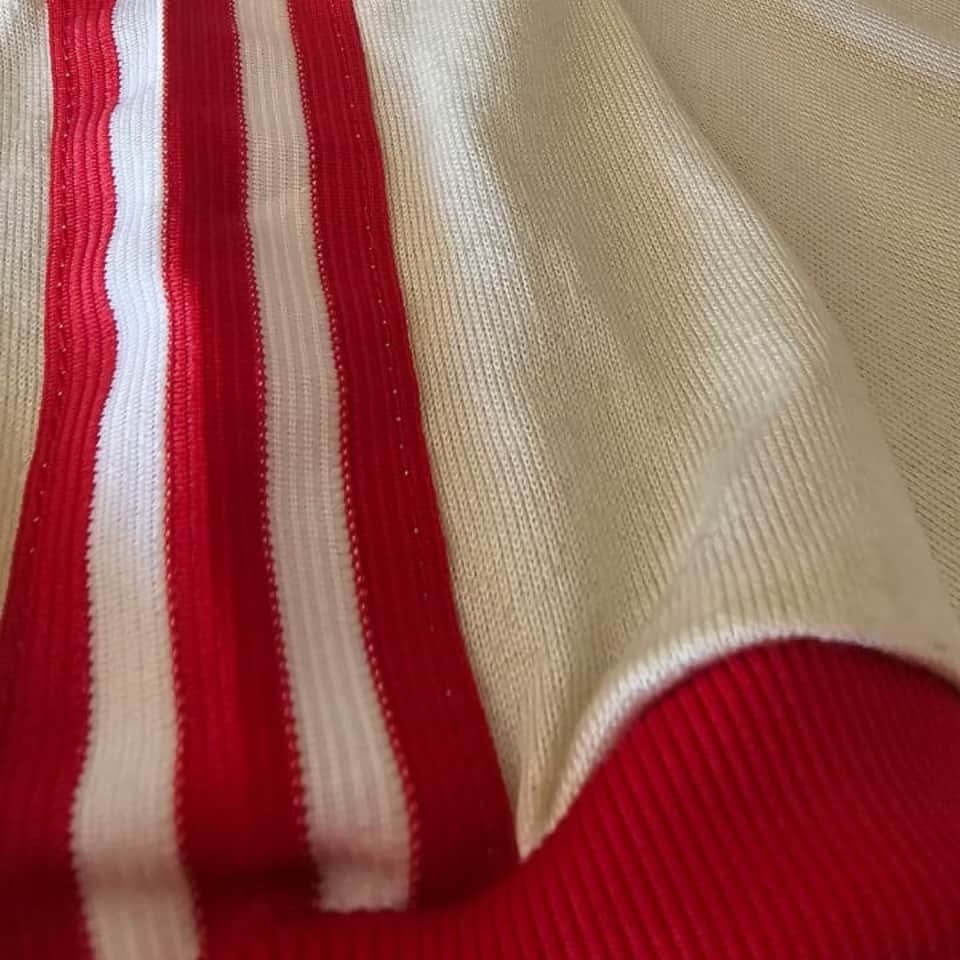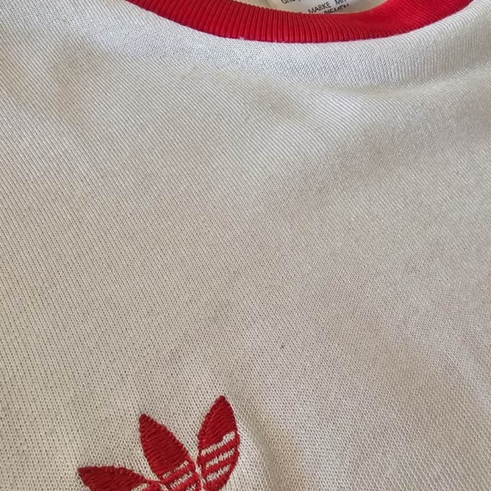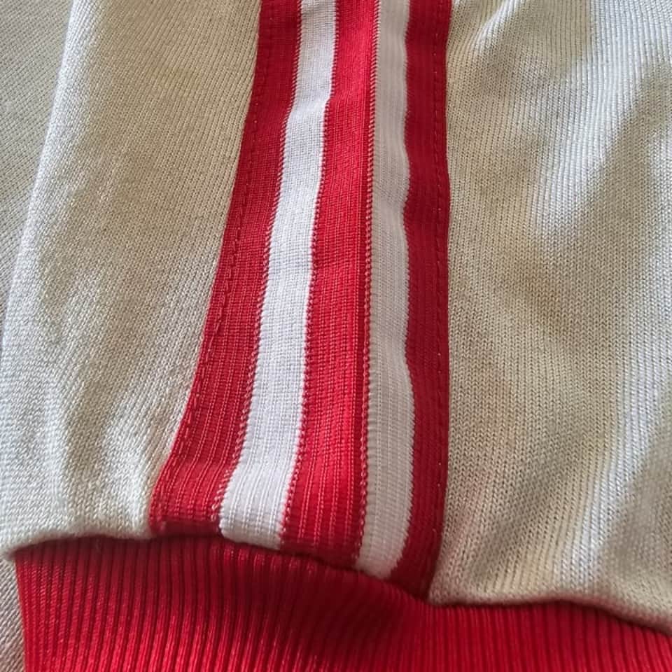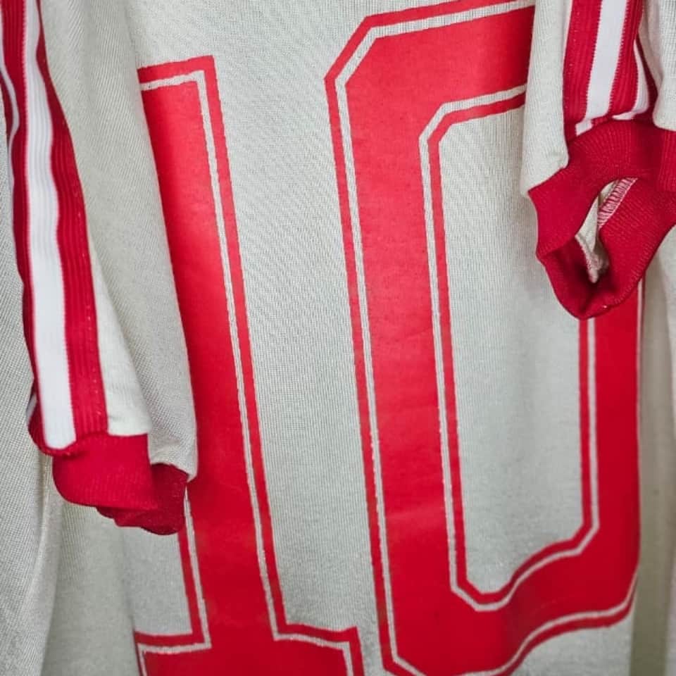 Argentinos Juniors white alternate jersey, adidas brand, round neck with red trim, short sleeves with red cuffs featuring the brand’s three red stripes extending from the neckline to the cuffs, red number 10 with red border, adidas logo embroidered on the right side of the chest, worn by Diego Maradona in the 1980 National Championship. Between 1976 and 1981, Diego Maradona played 166 matches and scored 116 goals for Argentinos Juniors, becoming the top scorer in Argentine football in five consecutive tournaments—between 1978 and 1980—a record that no one has matched. He debuted in the Primera Division at just 15 years old and quickly became a leading figure in Argentine football before his move to Boca Juniors.