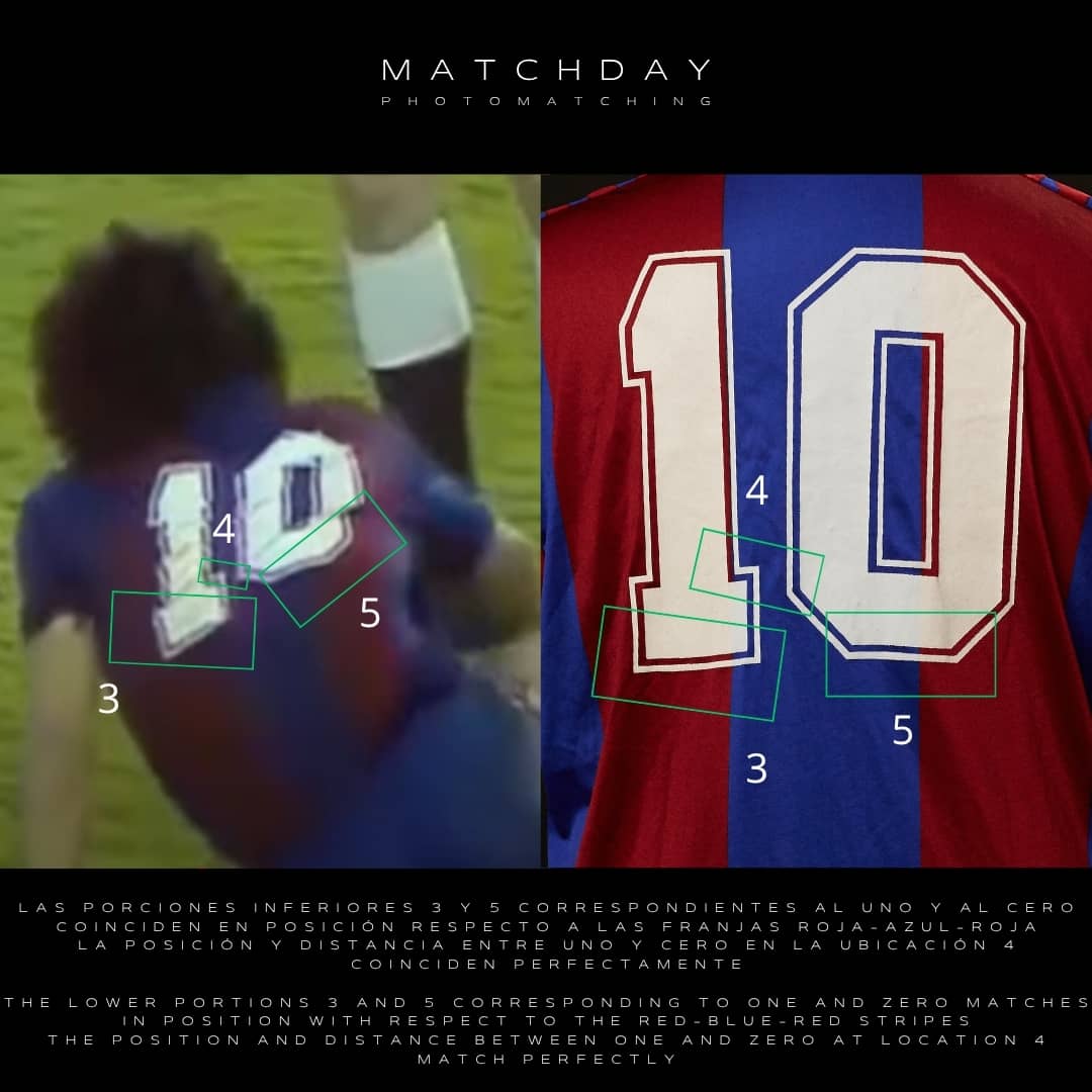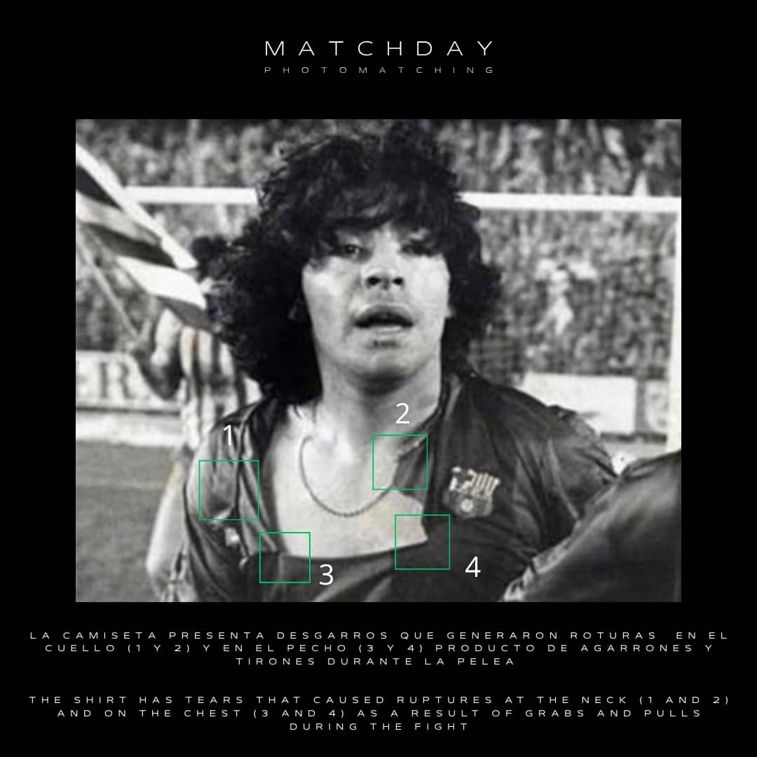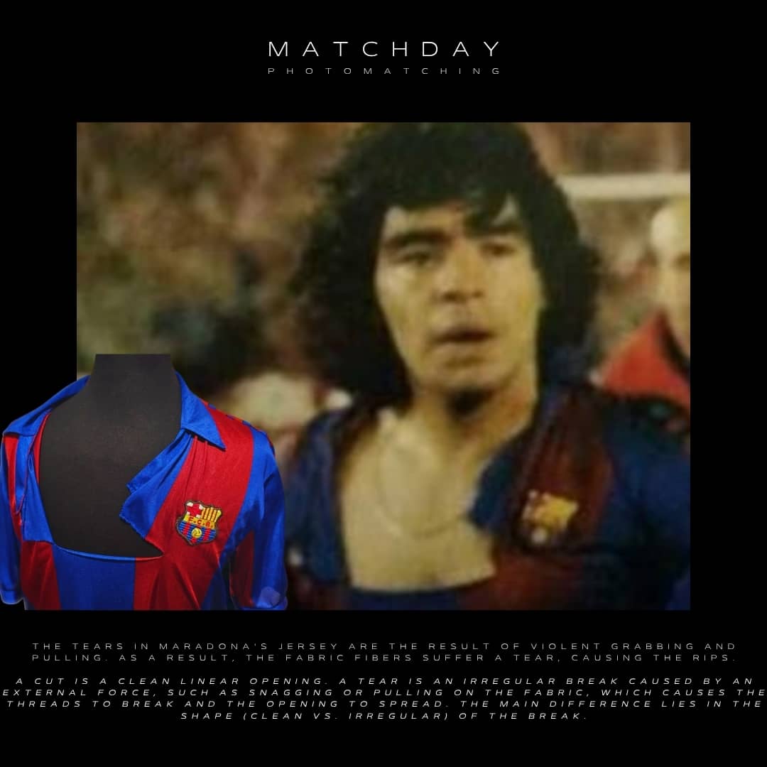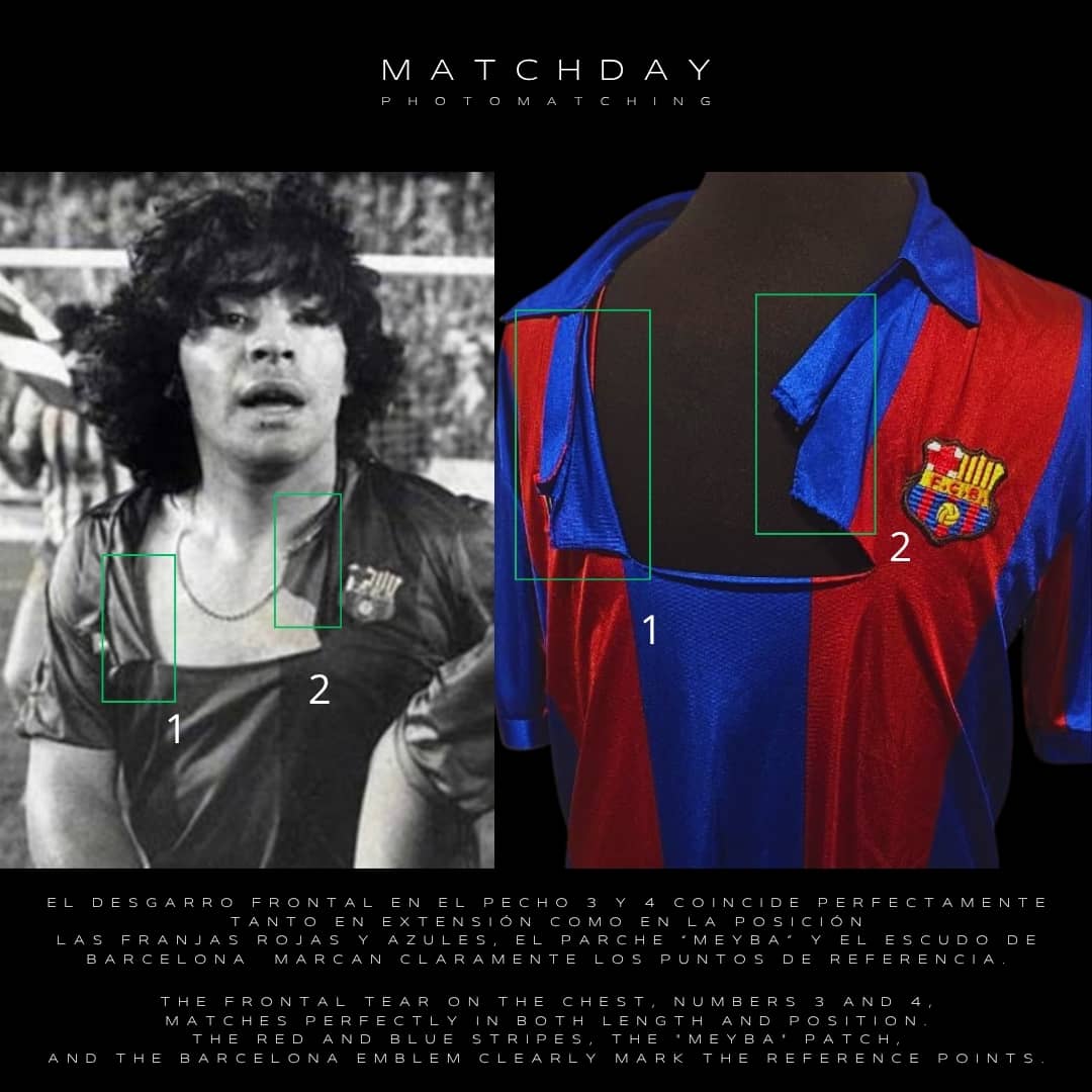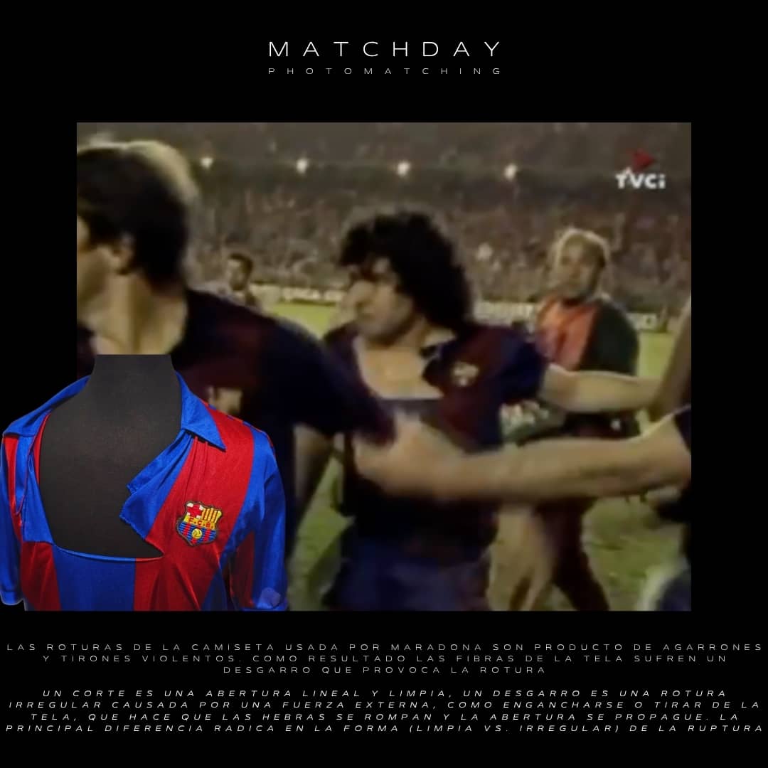 Camiseta titular del Fútbol Club Barcelona marca Meyba, fabricada en España, talle G, dorsal 10 pintado en color blanco, con el escudo bordado del Barcelona FC cosido en el pecho del lado izquierdo y el logo bordado de la marca Meyba cosido del lado derecho. Utilizada por Diego Maradona durante el segundo tiempo de la final de la Copa del Rey de la temporada 1983/84 versus Athletic Club de Bilbao el 5 de mayo de 1984 en el Estadio Santiago Bernabéu, en Madrid, España. La camiseta presenta una rotura en el cuello y un corte horizontal producto del forcejeo en la trifulca desatada al finalizar el encuentro. También presenta desgarros y el corte del borde del cuello. estas roturas hacen aún más singular a la camiseta usada por Diego, ya que el desgarro en la tela, el recorrido y la forma de este son garantía de autenticidad, más allá de la historia que encierra y representa, y que coloca a esta camiseta como una de las más icónicas en la historia del 10. La camiseta fue recogida en el vestuario por una lavandera del staff de utilería del club. Ante la imposibilidad de repararla, la conservó como recuerdo de aquel evento. Años después obsequió la camiseta al padre del actual propietario, un hombre que administraba un bar frecuentado por empleados culés. Esta joya permaneció en la familia cuatro décadas, hasta que su propietario decidió ponerla en subasta.