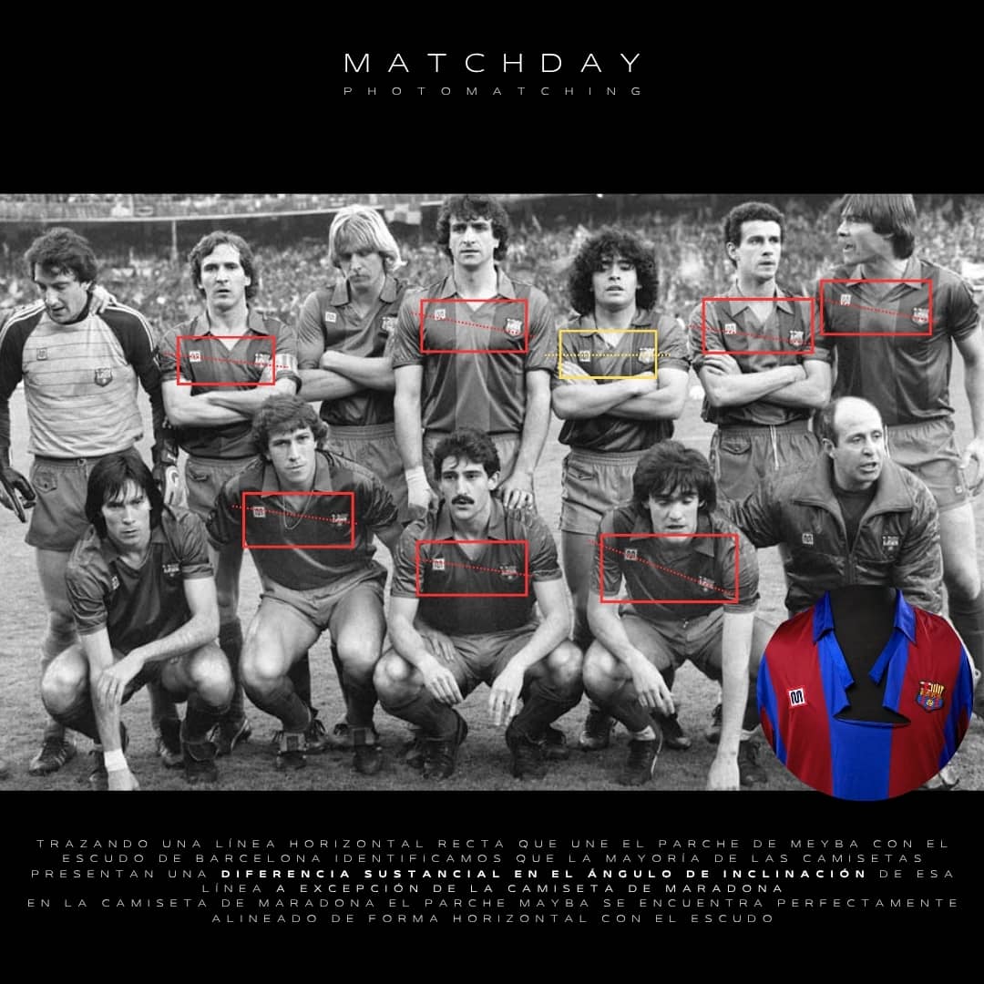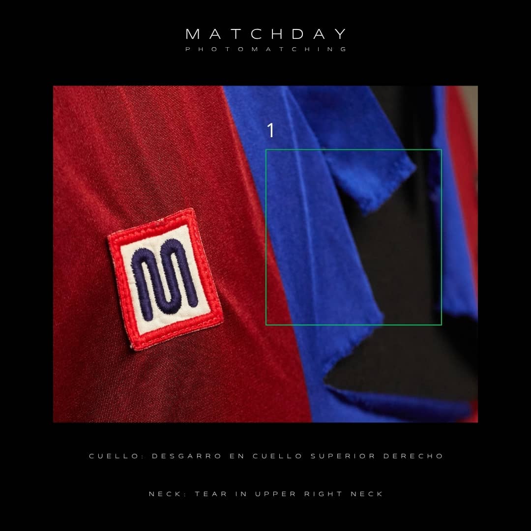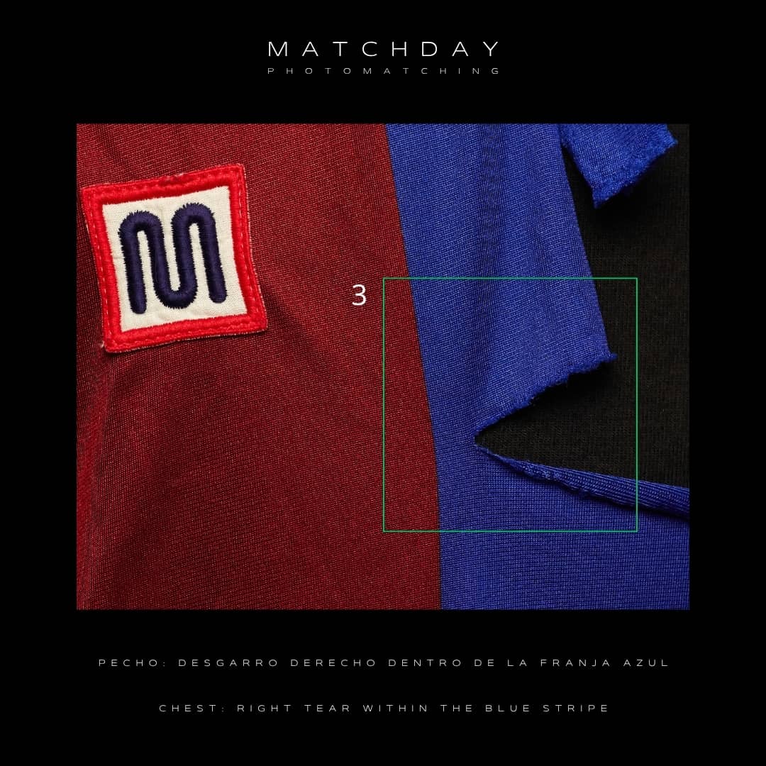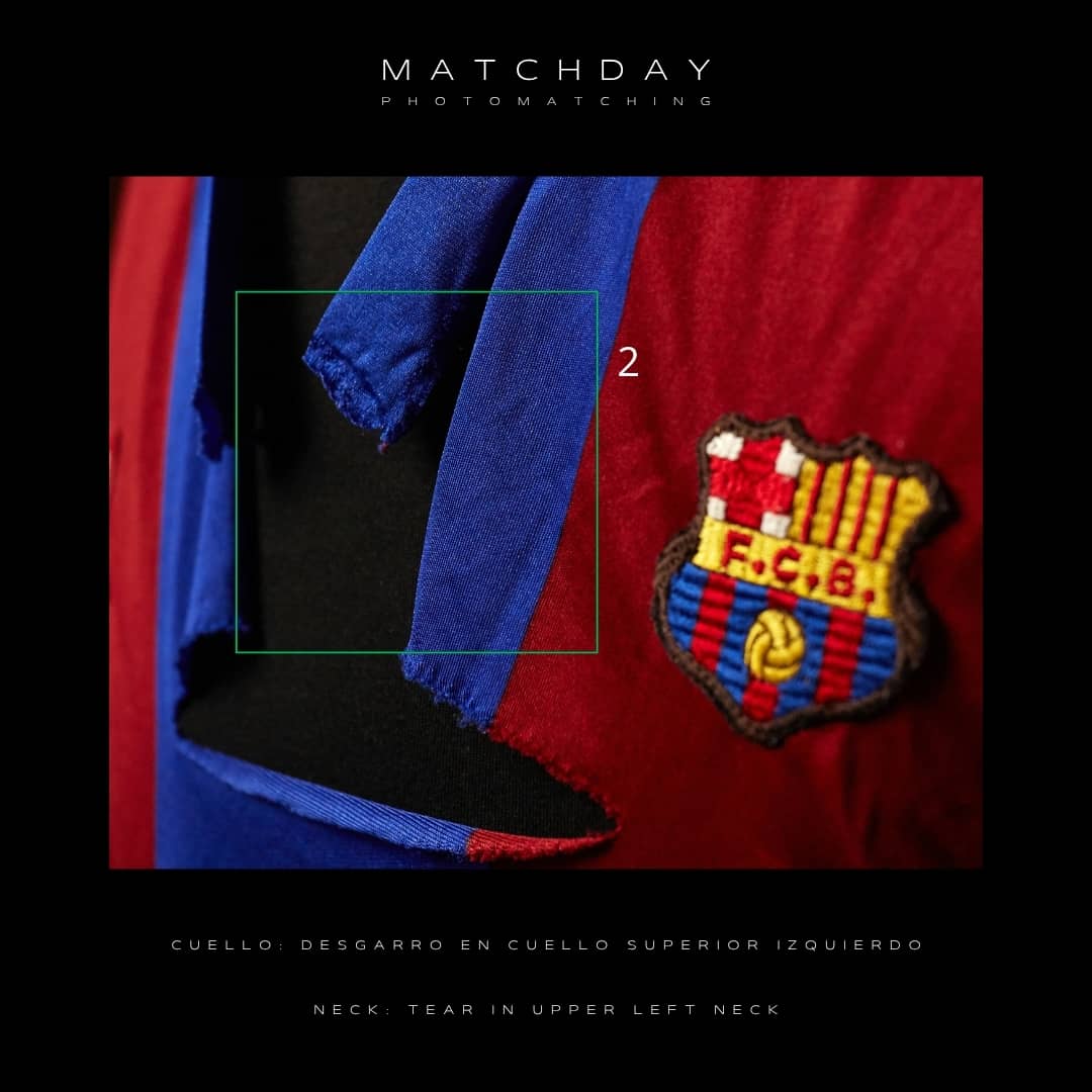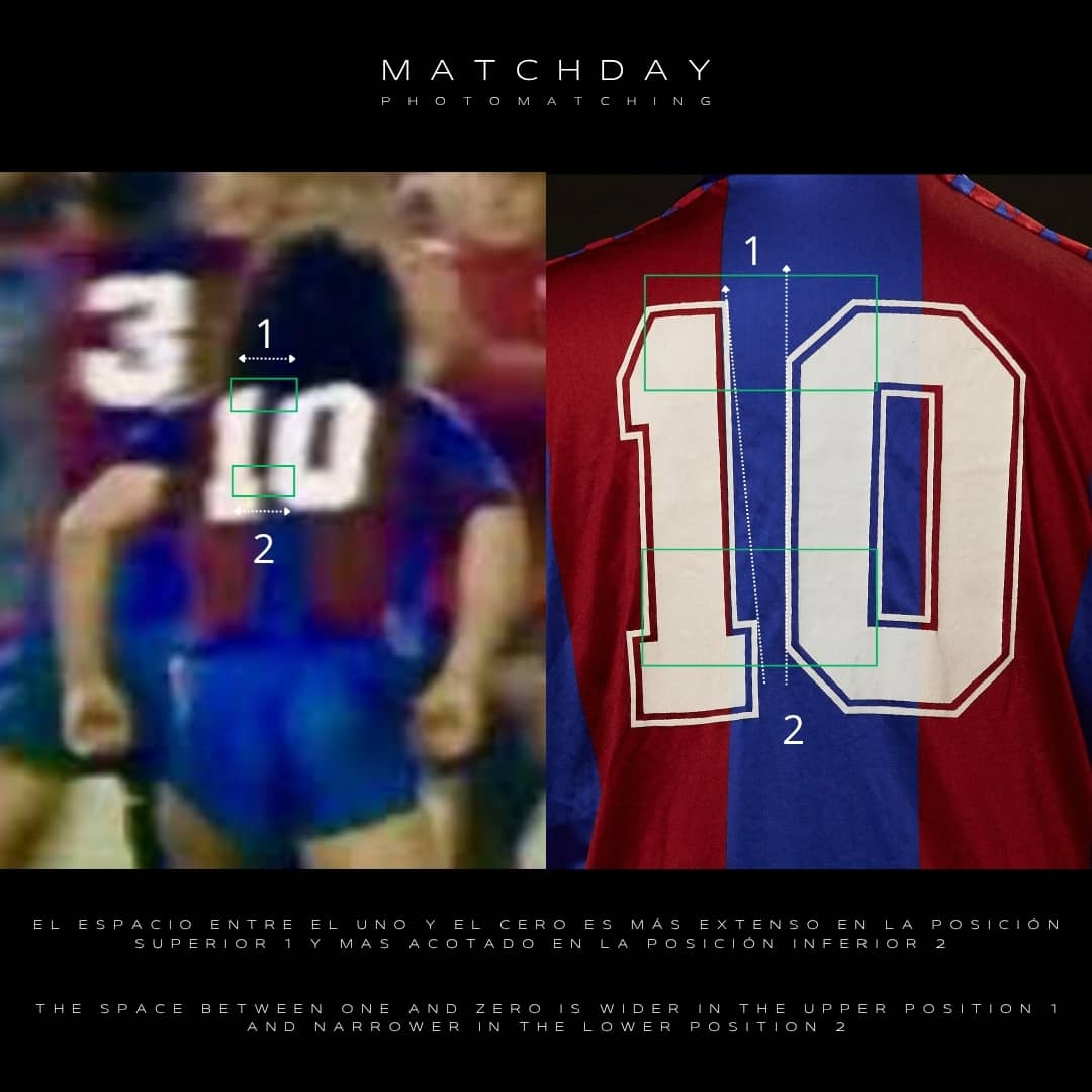 Camiseta titular del Fútbol Club Barcelona marca Meyba, fabricada en España, talle G, dorsal 10 pintado en color blanco, con el escudo bordado del Barcelona FC cosido en el pecho del lado izquierdo y el logo bordado de la marca Meyba cosido del lado derecho. Utilizada por Diego Maradona durante el segundo tiempo de la final de la Copa del Rey de la temporada 1983/84 versus Athletic Club de Bilbao el 5 de mayo de 1984 en el Estadio Santiago Bernabéu, en Madrid, España. La camiseta presenta una rotura en el cuello y un corte horizontal producto del forcejeo en la trifulca desatada al finalizar el encuentro. También presenta desgarros y el corte del borde del cuello. estas roturas hacen aún más singular a la camiseta usada por Diego, ya que el desgarro en la tela, el recorrido y la forma de este son garantía de autenticidad, más allá de la historia que encierra y representa, y que coloca a esta camiseta como una de las más icónicas en la historia del 10. La camiseta fue recogida en el vestuario por una lavandera del staff de utilería del club. Ante la imposibilidad de repararla, la conservó como recuerdo de aquel evento. Años después obsequió la camiseta al padre del actual propietario, un hombre que administraba un bar frecuentado por empleados culés. Esta joya permaneció en la familia cuatro décadas, hasta que su propietario decidió ponerla en subasta.