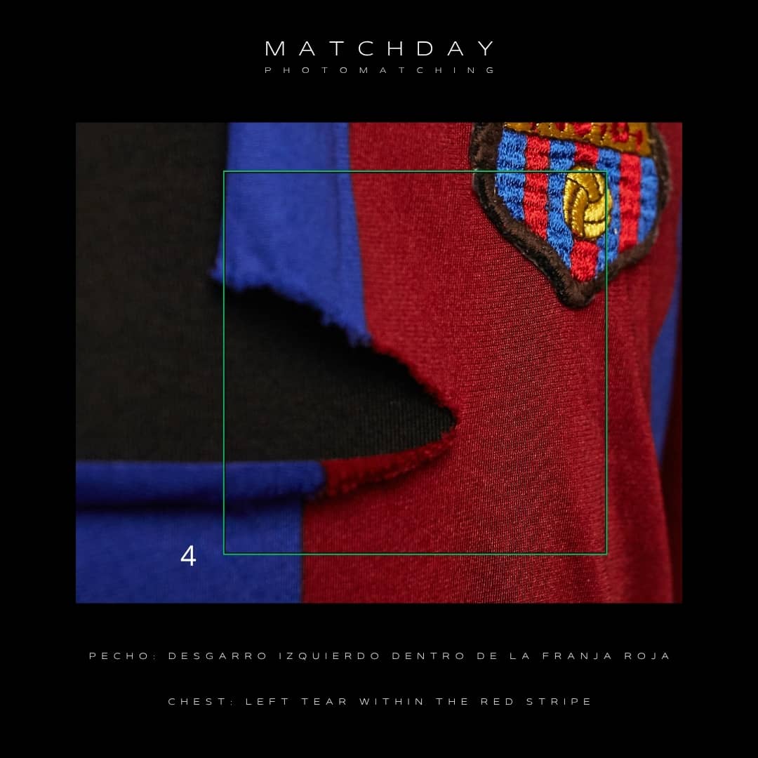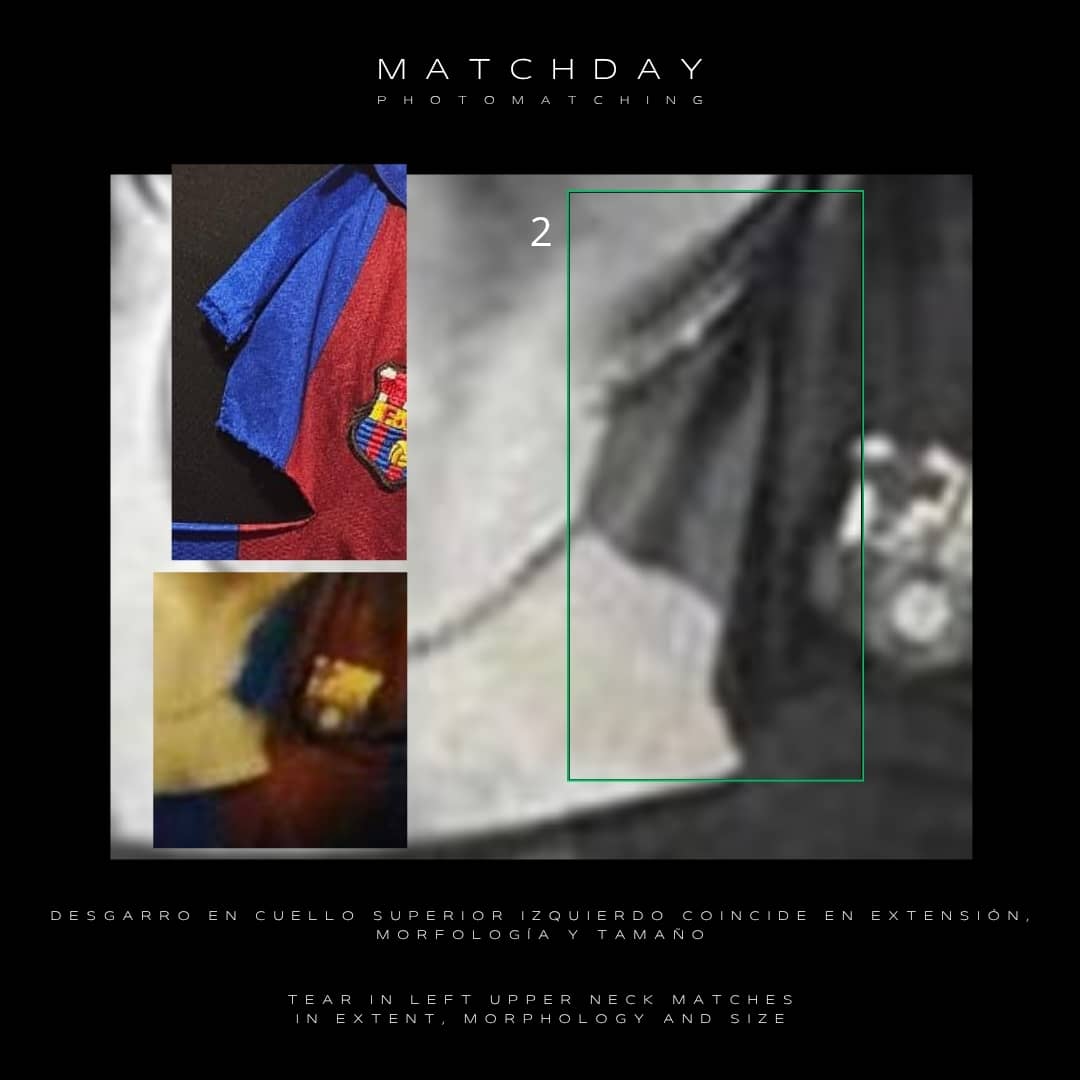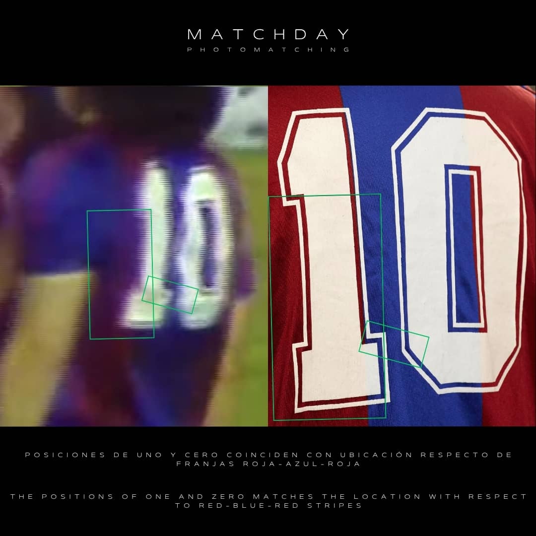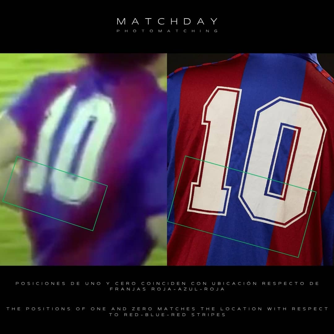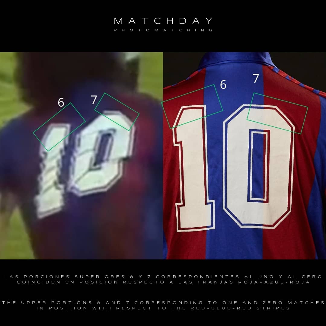 Camiseta titular del Fútbol Club Barcelona marca Meyba, fabricada en España, talle G, dorsal 10 pintado en color blanco, con el escudo bordado del Barcelona FC cosido en el pecho del lado izquierdo y el logo bordado de la marca Meyba cosido del lado derecho. Utilizada por Diego Maradona durante el segundo tiempo de la final de la Copa del Rey de la temporada 1983/84 versus Athletic Club de Bilbao el 5 de mayo de 1984 en el Estadio Santiago Bernabéu, en Madrid, España. La camiseta presenta una rotura en el cuello y un corte horizontal producto del forcejeo en la trifulca desatada al finalizar el encuentro. También presenta desgarros y el corte del borde del cuello. estas roturas hacen aún más singular a la camiseta usada por Diego, ya que el desgarro en la tela, el recorrido y la forma de este son garantía de autenticidad, más allá de la historia que encierra y representa, y que coloca a esta camiseta como una de las más icónicas en la historia del 10. La camiseta fue recogida en el vestuario por una lavandera del staff de utilería del club. Ante la imposibilidad de repararla, la conservó como recuerdo de aquel evento. Años después obsequió la camiseta al padre del actual propietario, un hombre que administraba un bar frecuentado por empleados culés. Esta joya permaneció en la familia cuatro décadas, hasta que su propietario decidió ponerla en subasta.