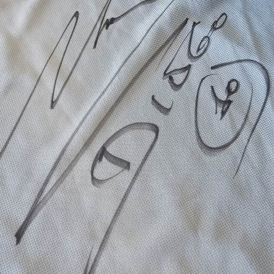Camiseta obtenida por un organizador de los eventos de Showbol donde jugaba Maradona. A diferencia de los modelos de tienda, donde los números eran sublimados, en esta camiseta son estampados.