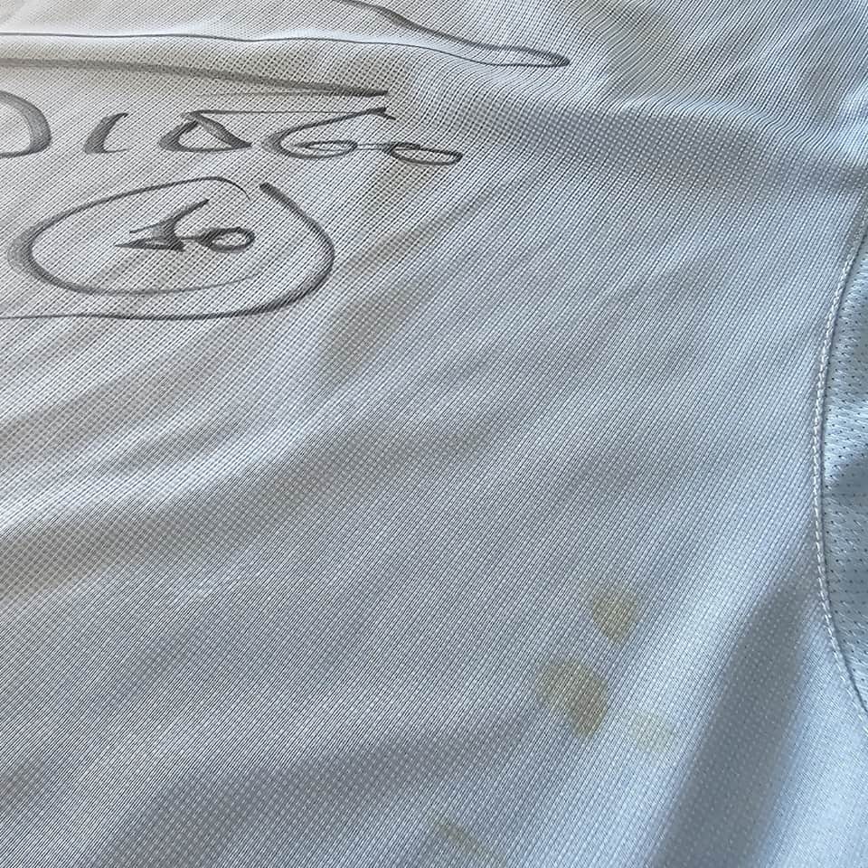 Camiseta usada en juego sin lavar y firmada en la espalda por Diego Armando Maradona.