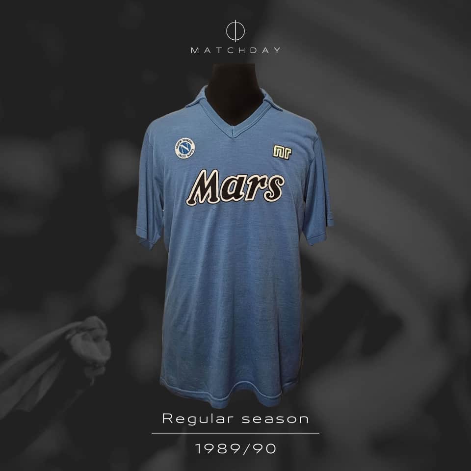 Modelo de camiseta tela de verano sponsor “Mars” con la tipografía redondeada en las puntas color negra con bordes blancos. Mangas cortas, cuello polo no comercializada en tiendas. Etiqueta interna “CTR” y etiqueta “NR” distinta a las de tienda como corresponde en las camisetas de juego preparadas en utilería. Modelo usado muy pocos partidos durante la temporada 1989/1990 en Serie A. Fabricada en Italia, dorsal 10 en tela blanca, cosido en zigzag.