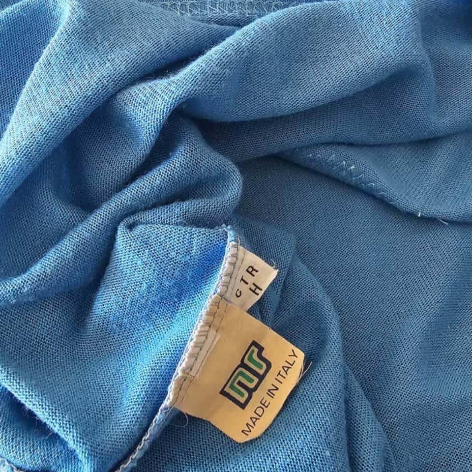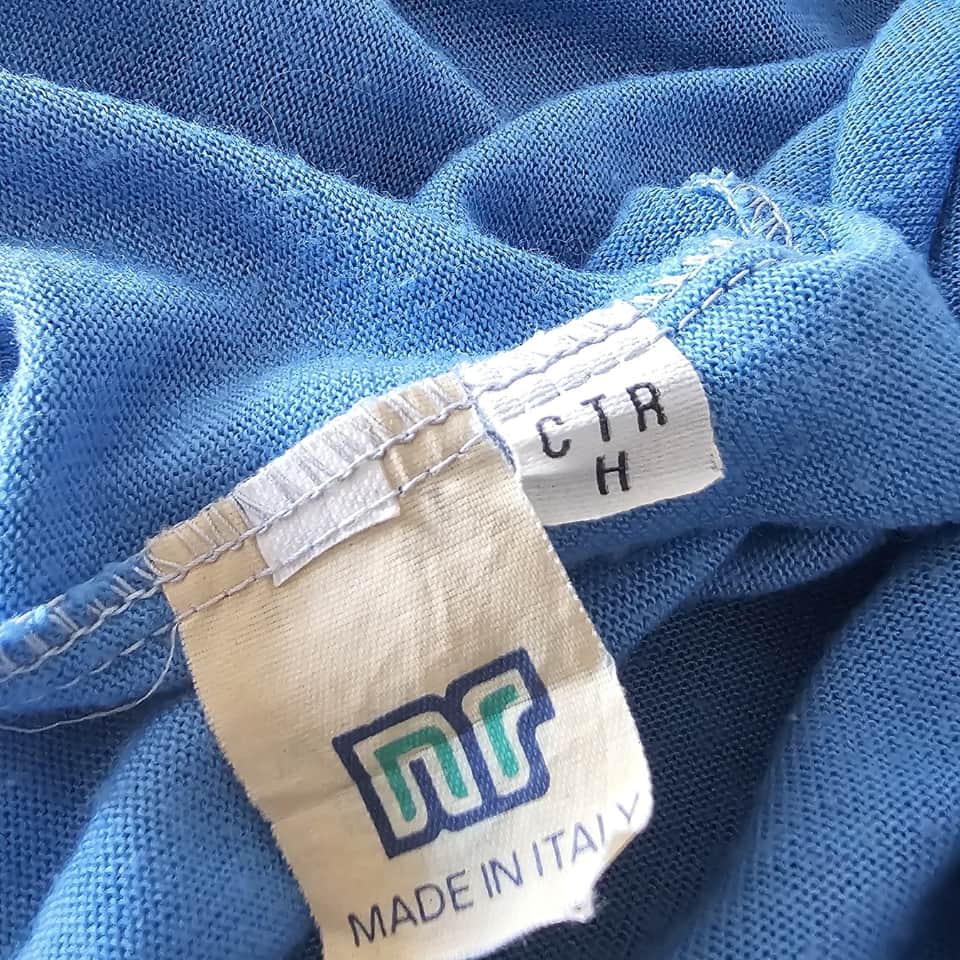 Summer fabric jersey model sponsored by “Mars” with rounded black lettering with white edges. Short sleeves, polo collar not sold in stores. Internal ‘CTR’ label and “NR” label different from those in stores, as is customary for game shirts prepared in the equipment room. Model worn in very few games during the 1989/1990 season. Made in Italy, size 10 in white fabric, zigzag stitching.