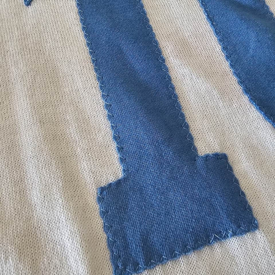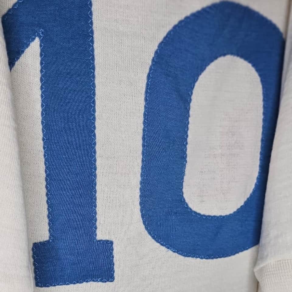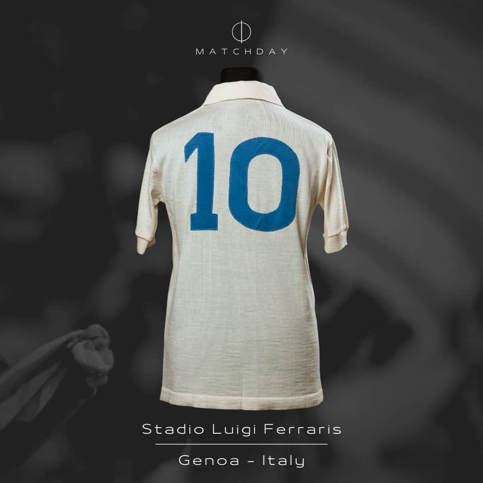 Winter fabric jersey with black crest and red sponsor logo, model used in very few games that had already been used in the previous season (1988/89). SSC Napoli alternate jersey in white, short sleeves, polo collar, NR brand, made in Italy, number 10 in light blue fabric, zigzag stitching, with red Mars sponsor painted on the chest, the SSC Napoli crest in black and light blue (very rare) embroidered on the right side of the chest and the NR logo embroidered on the left side. It was a model made with winter fabric used during the 1988/89 season and worn again in very few matches in 1990. Diego Maradona wore this jersey in the match between Sampdoria 2 vs 1 Napoli on March 18, 1990, at the Luigi Ferraris Stadium in Genoa, Italy, corresponding to matchday 29 of Italy’s Serie A.