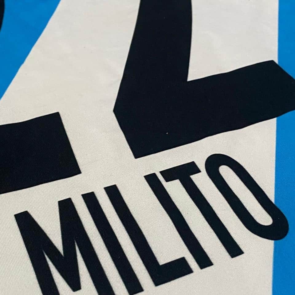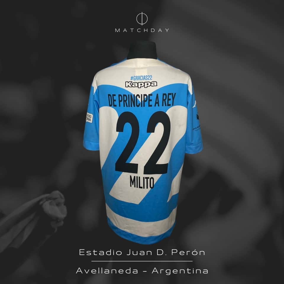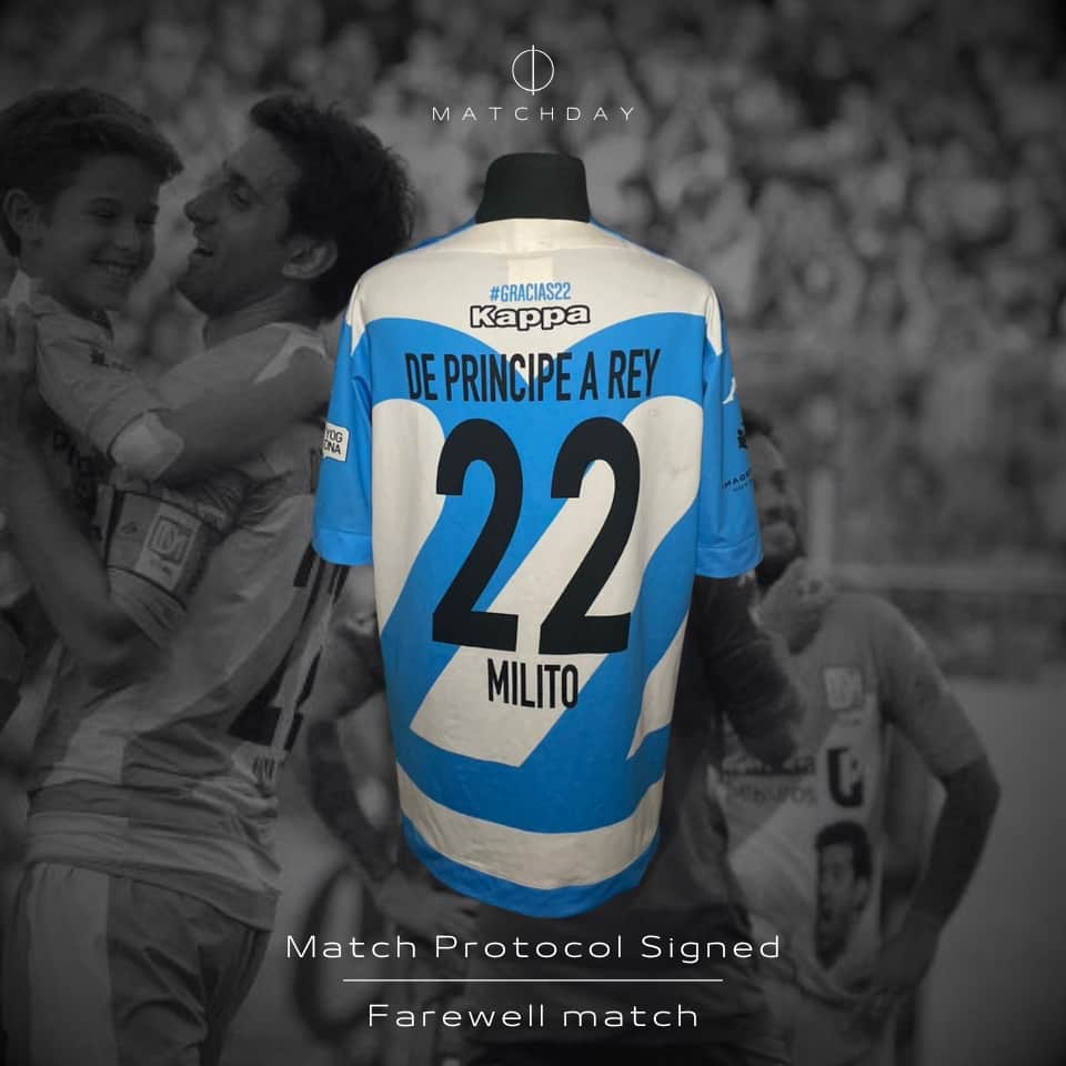 Jersey gifted and signed by Diego Milito in his farewell match to Humberto Maschio, former player and Racing Club’s glory. The jersey was obtained through Humberto Maschio’s family.