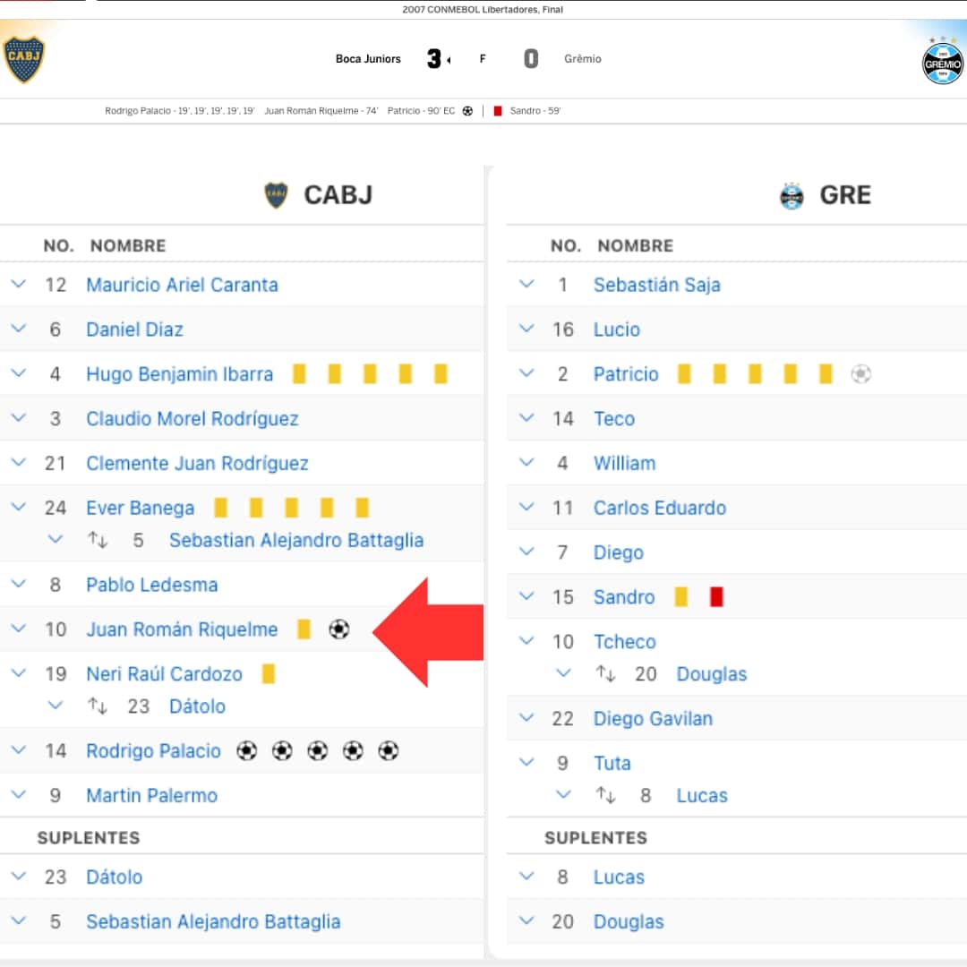 En el minuto 72 le convierten la falta a Riquelme que mancha el número como se ve en las fotos y posterior convierte el segundo gol del partido de tiro libre.
